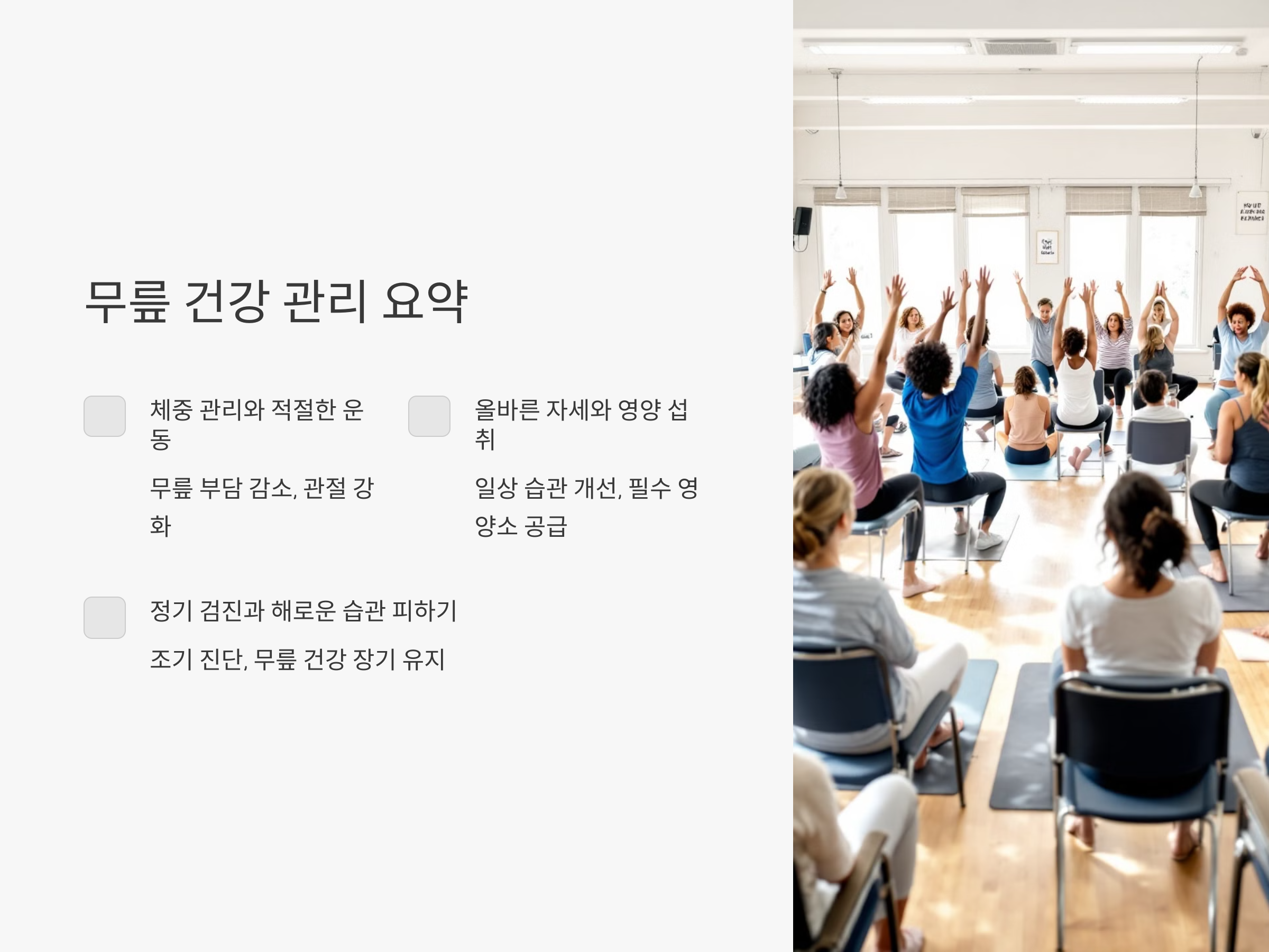 - 체중 감량: 무릎 통증을 예방하고 관절염 위험을 낮춥니다.