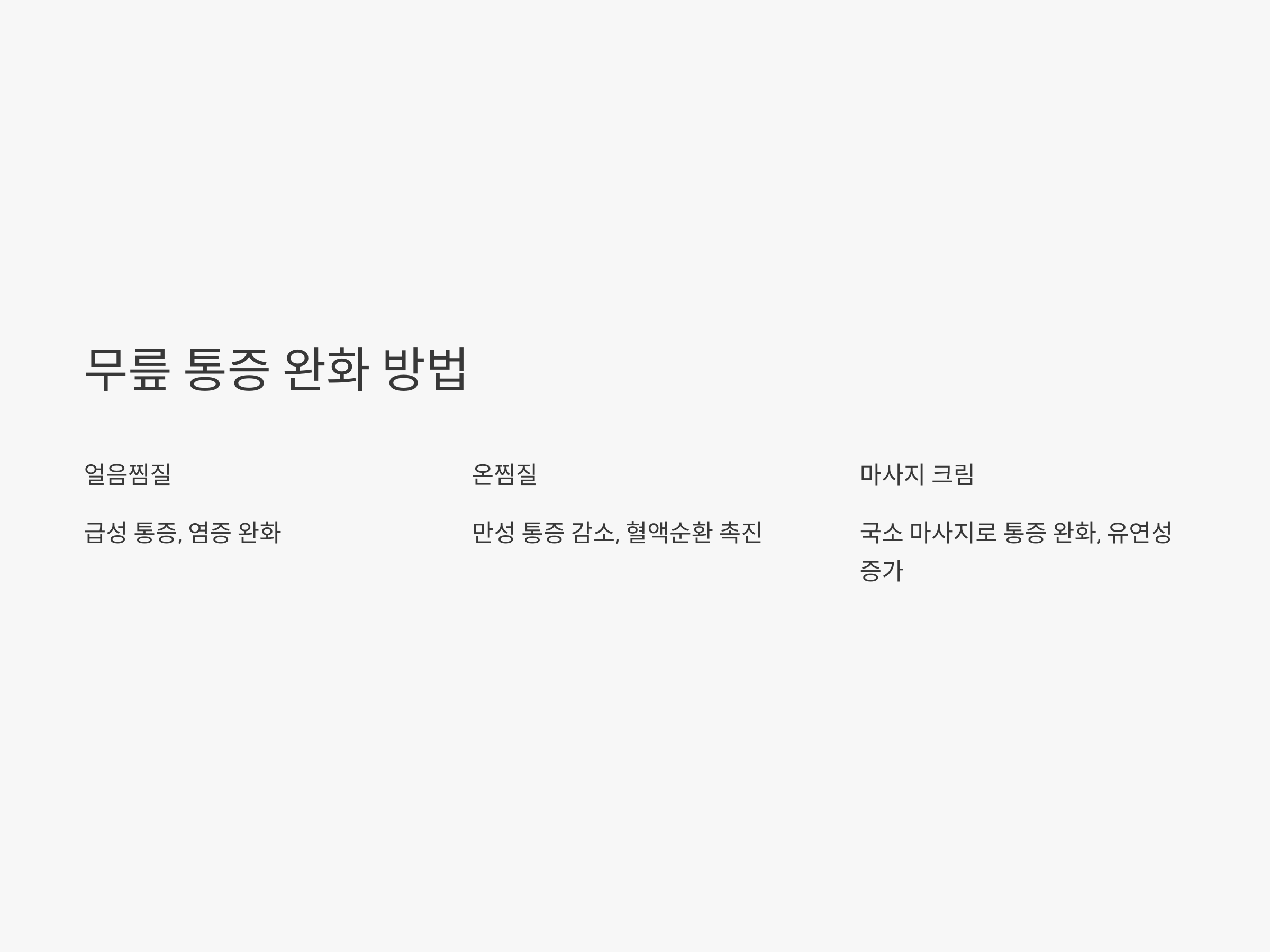 - 얼음찜질: 급성 통증이나 염증이 있는 경우 사용하세요.