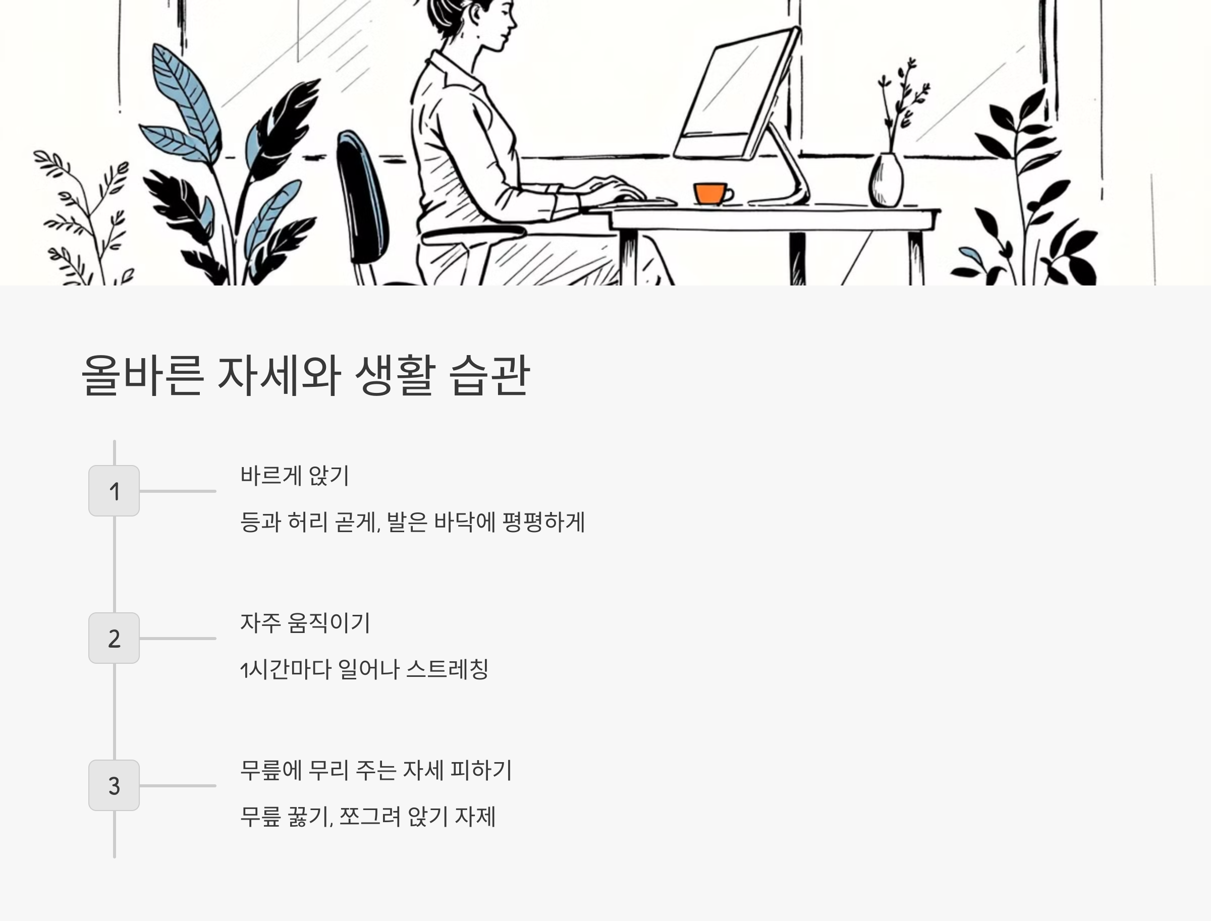 - 의자에 바르게 앉기: 등과 허리를 곧게 펴고, 발은 바닥에 평평하게 둡니다.