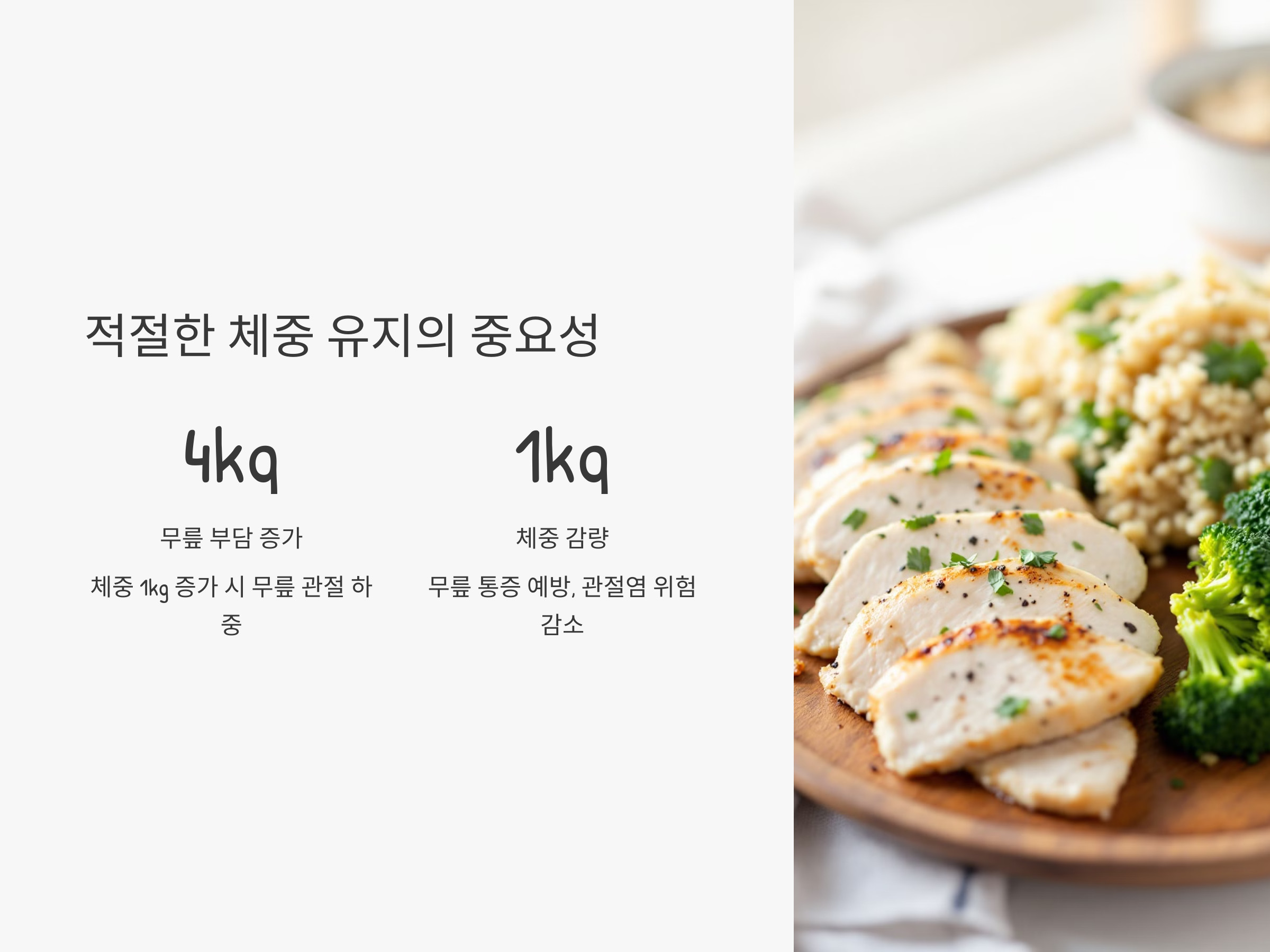체중이 증가할수록 무릎 관절에 가해지는 압력도 커지게 됩니다. 체중 1kg 증가 시 무릎 관절에 가해지는 하중은 약 4kg 이상 늘어난다고 알려져 있습니다. 따라서 건강한 식습관과 꾸준한 운동으로 적정 체중을 유지하는 것이 중요합니다. 특히, 고지방 음식과 당분 섭취를 줄이고 채소와 단백질 중심의 균형 잡힌 식사를 실천하세요.