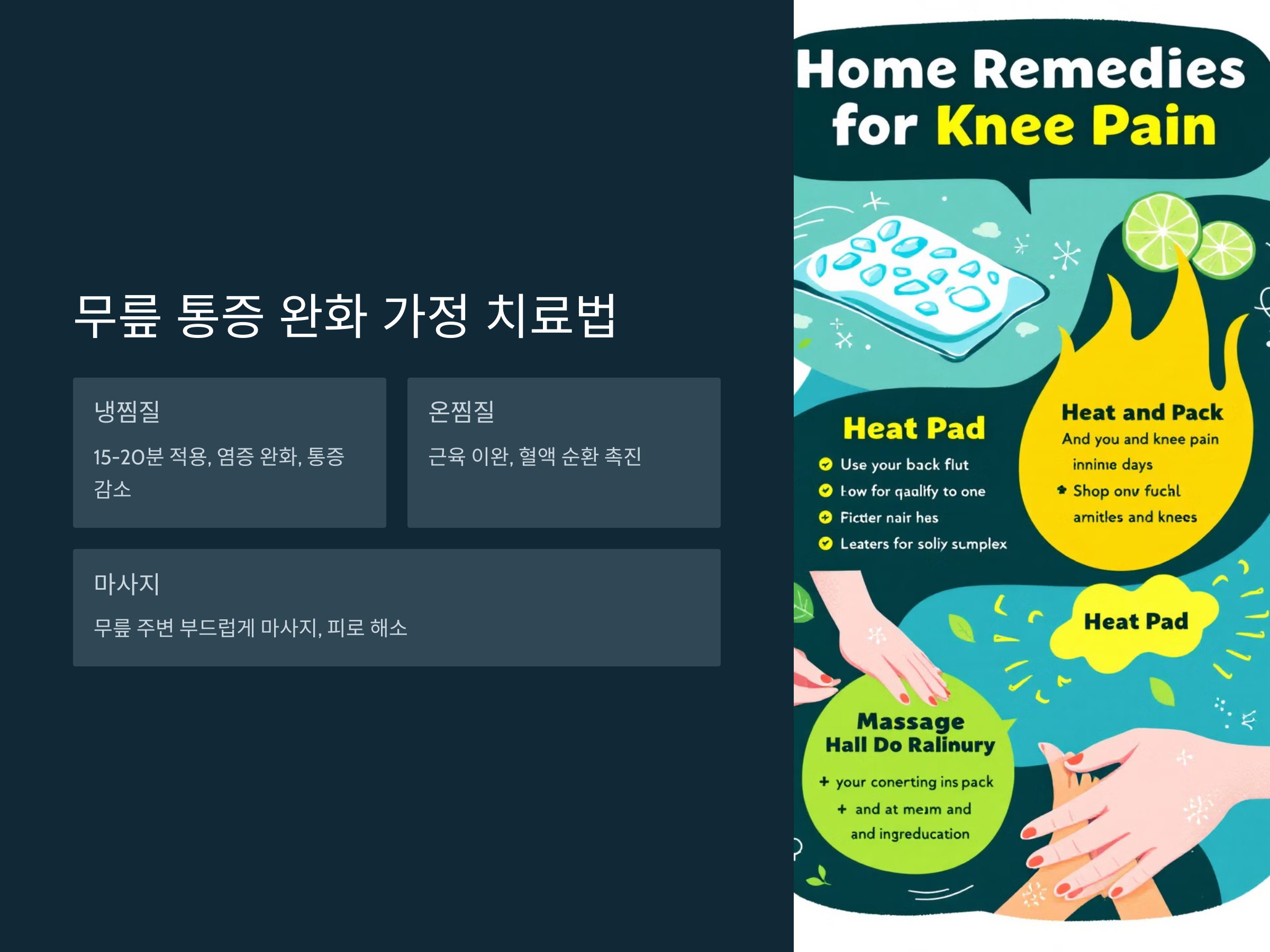 무릎에 염증이나 통증이 있을 때, 냉찜질은 통증을 줄이고 염증을 완화하는 데 도움이 됩니다. 냉찜질을 15분에서 20분 정도 해주면, 무릎 주변의 염증이 가라앉고 통증이 완화됩니다. 단, 찬물이나 얼음팩을 바로 피부에 대지 않도록 천이나 타월에 감싸서 사용해야 합니다.