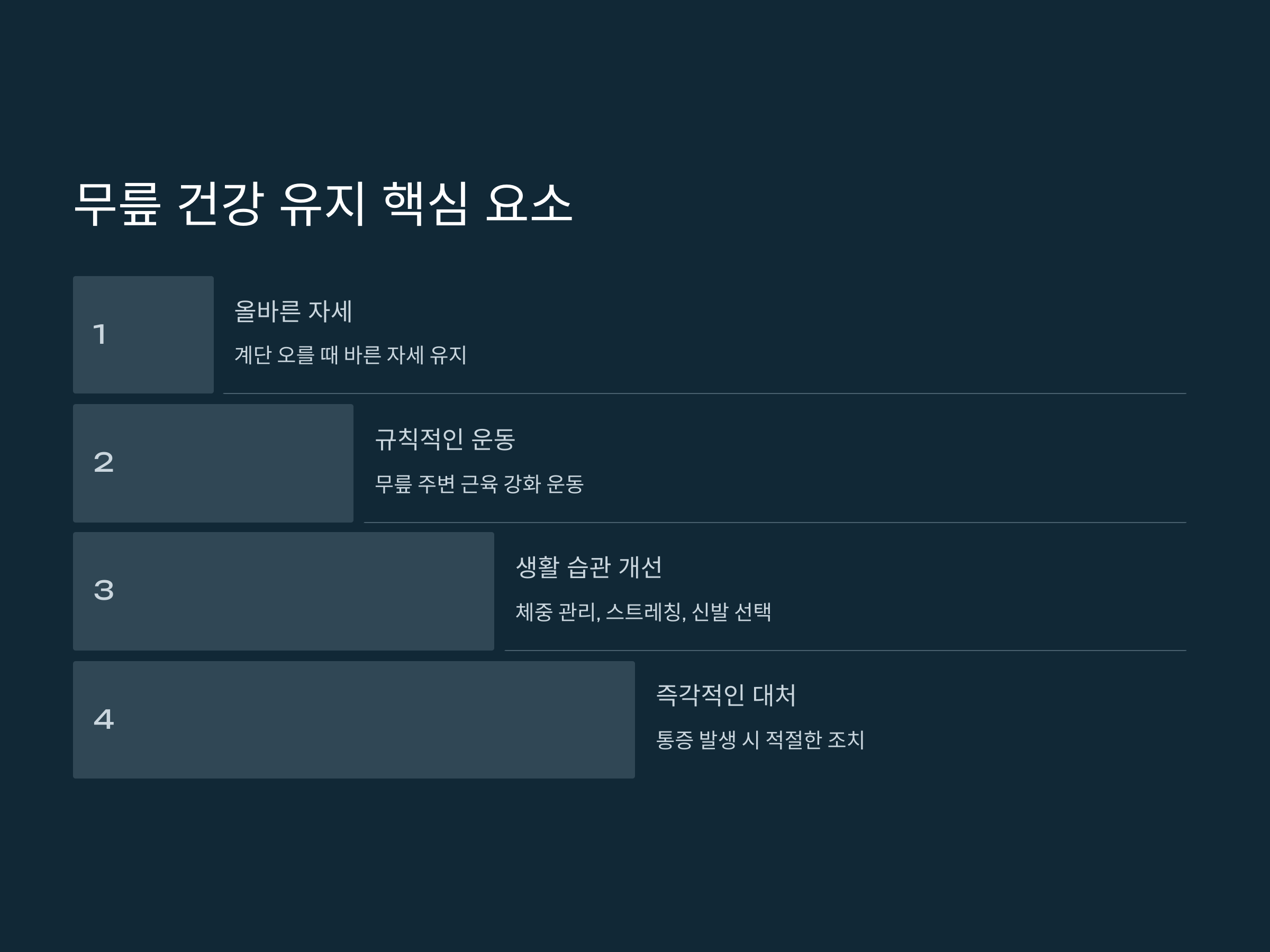 무릎 건강을 지키는 것은 우리가 일상 생활에서 무리 없이 활동을 지속하기 위해 필수적인 부분입니다. 계단을 오를 때 무릎에 가해지는 부담을 줄이고, 올바른 자세와 운동으로 무릎을 보호하면, 오랫동안 건강한 무릎을 유지할 수 있습니다. 무릎에 통증이 발생하면 즉시 대처하고, 예방적인 운동과 생활 습관을 통해 무릎을 잘 관리합시다.