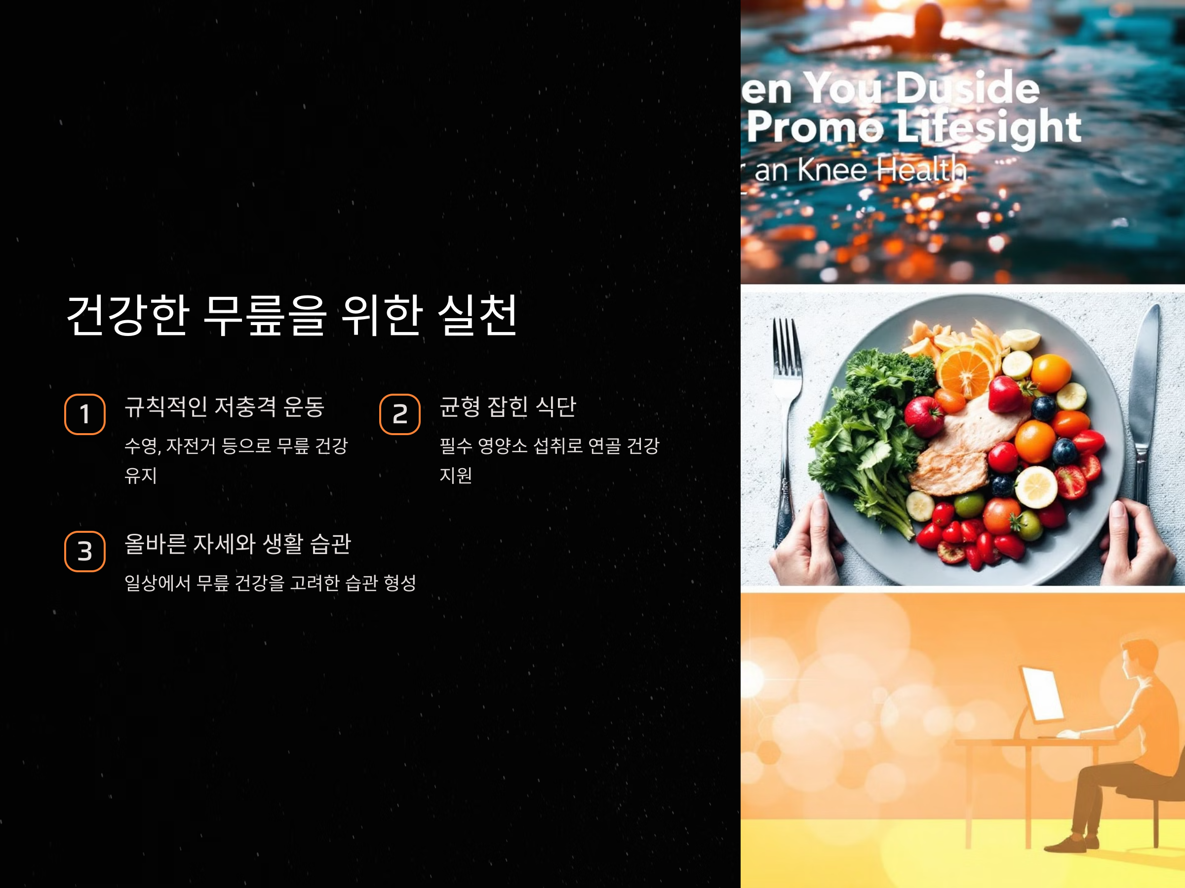 - 무릎에 부담을 주지 않는 운동이 좋습니다. 예를 들어 수영이나 자전거 타기가 추천됩니다.