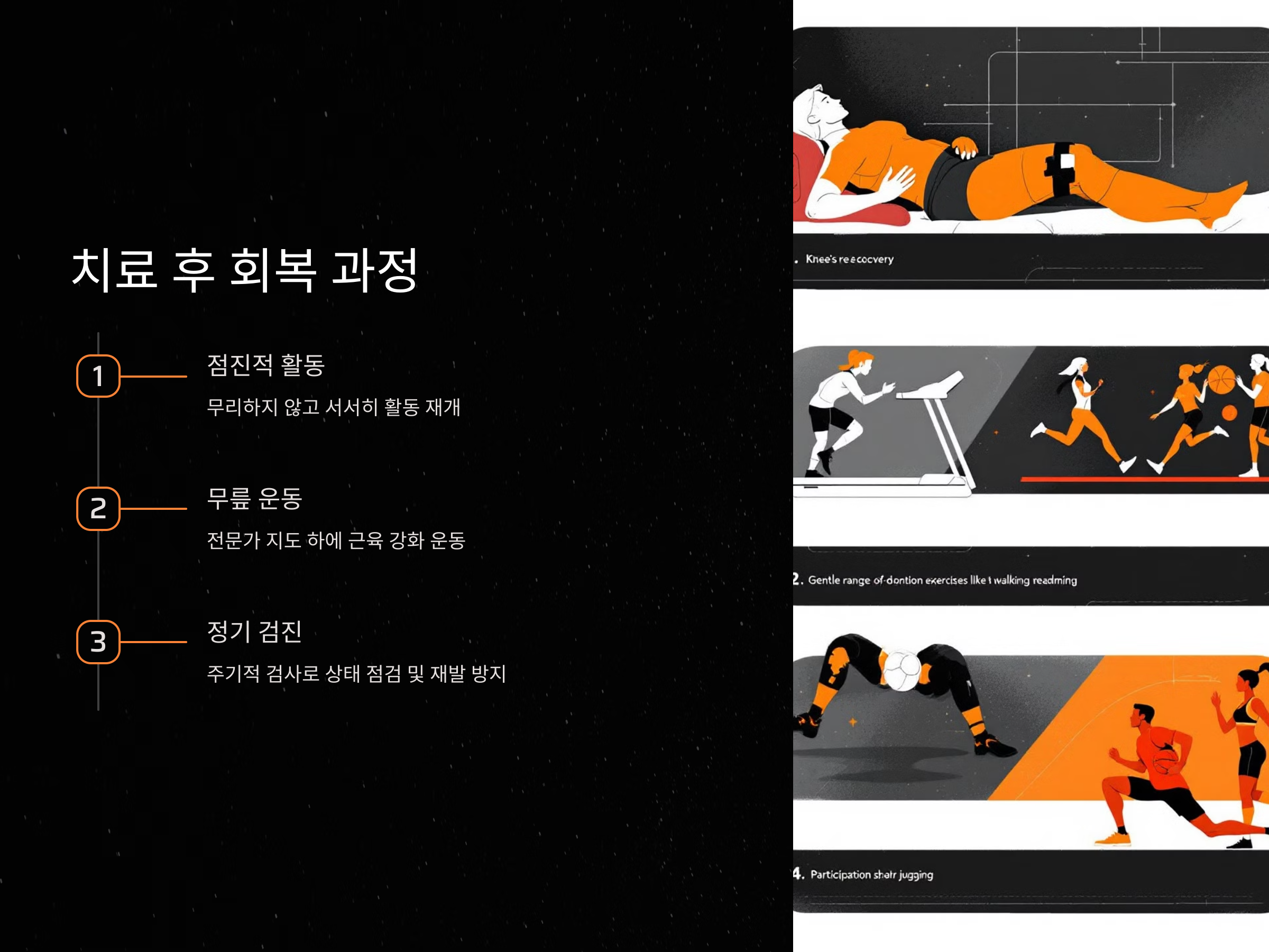 회복 중인 무릎을 너무 무리하게 사용하지 않도록 주의하면서도, 점진적인 운동을 통해 근육을 강화하는 것이 필요합니다. 전문가의 지도를 받으며 운동을 시작하는 것이 좋습니다.