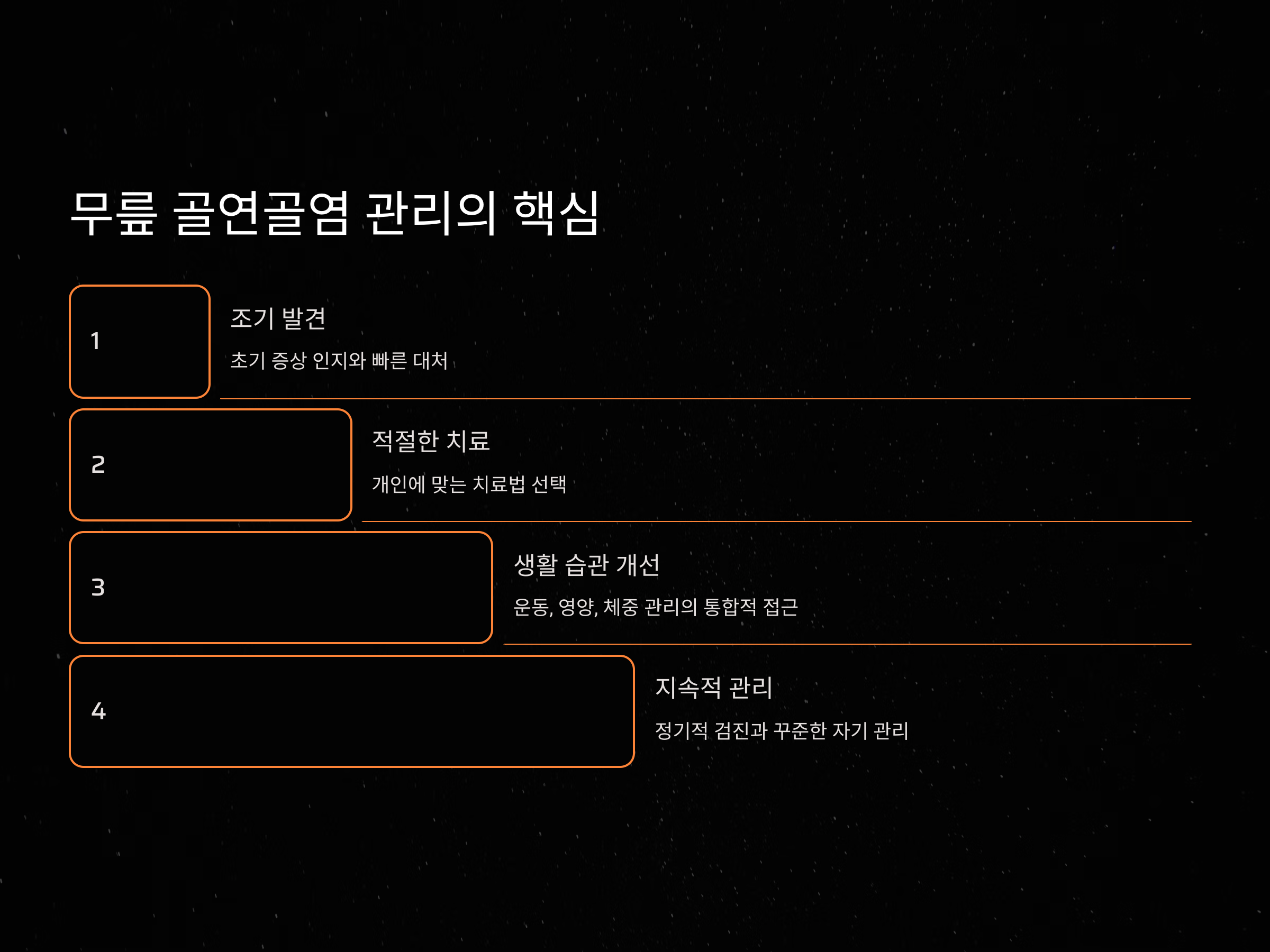무릎 골연골염은 증상이 서서히 진행되므로, 초기 증상을 놓치지 않고 적절히 대처하는 것이 중요합니다. 이 질환에 대해 잘 알고, 예방 방법을 실천한다면 건강한 무릎을 오랫동안 유지할 수 있습니다. 자신의 무릎 건강을 잘 챙기세요!