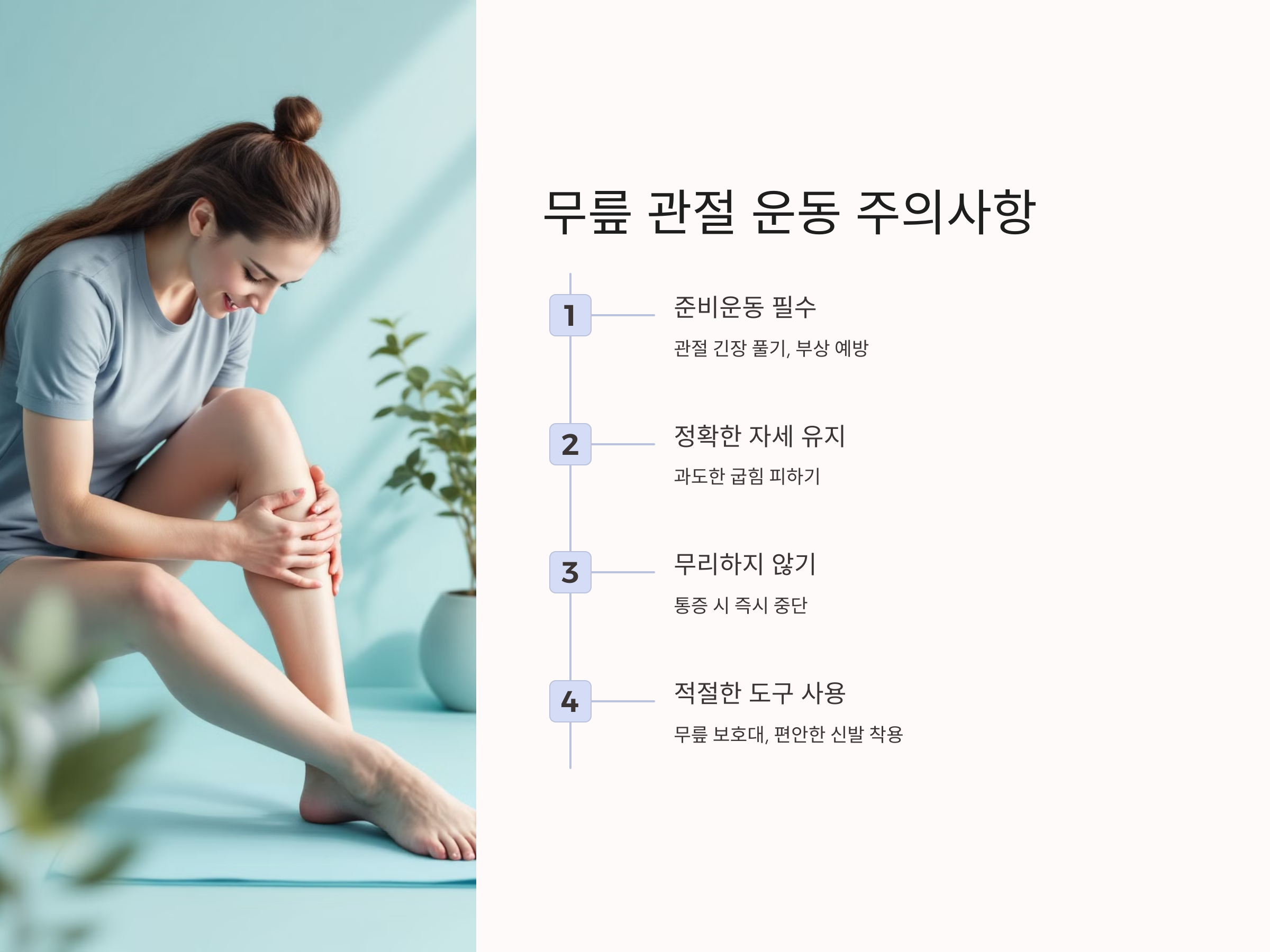 운동이 무릎 관절 건강에 좋다고 하더라도 잘못된 방법으로 실행하면 오히려 해가 될 수 있습니다. 다음 주의사항을 꼭 기억하세요.