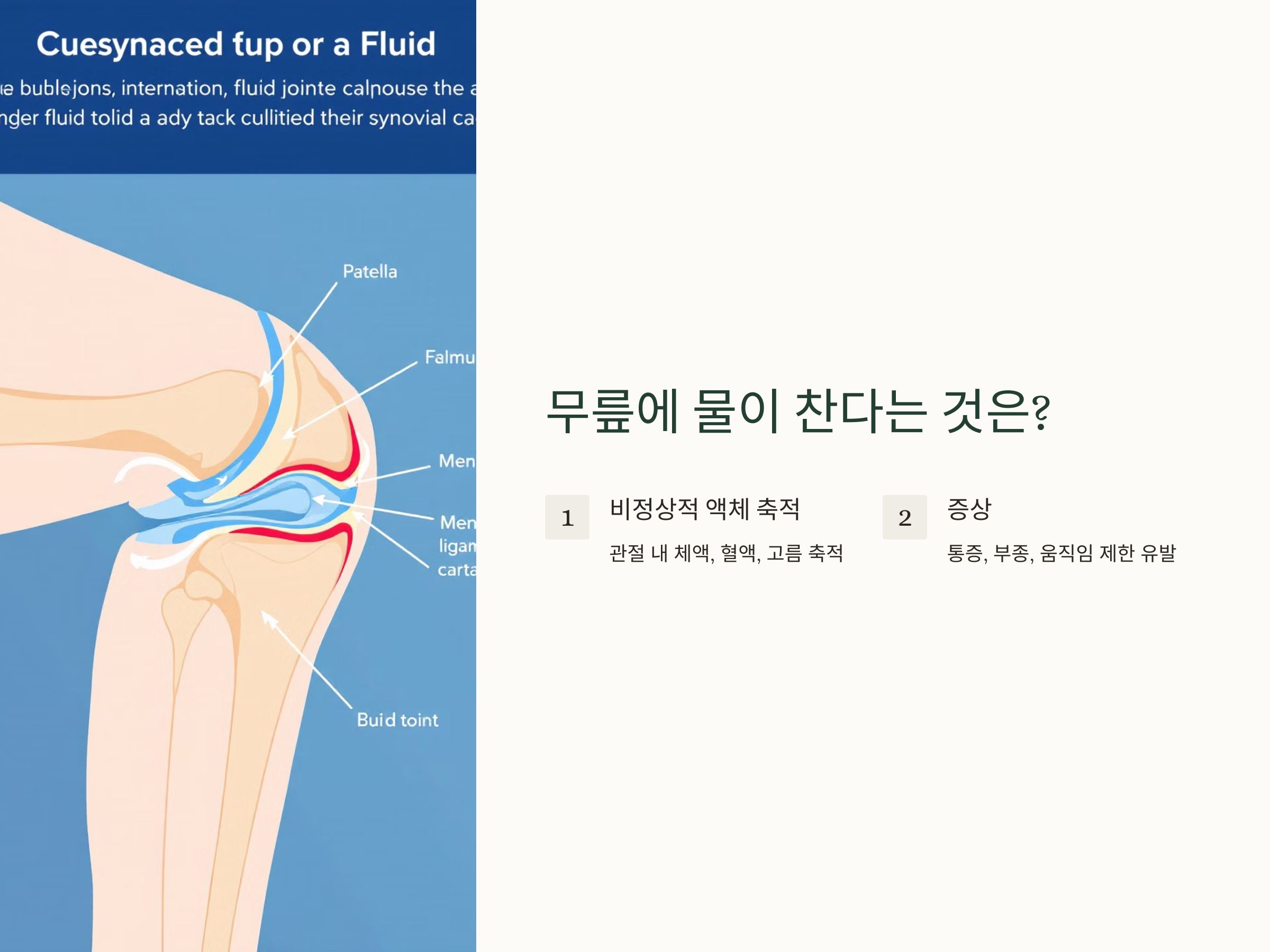 무릎에 물이 찬다는 것은 무릎 관절 내에 비정상적으로 액체가 축적되는 현상을 의미합니다. 이 액체는 일반적으로 체액이나 혈액, 또는 염증이 있는 상태에서 분비된 고름일 수 있습니다. 이러한 액체의 축적은 무릎 관절을 압박하고, 통증이나 부종을 일으키며, 심한 경우 무릎을 제대로 움직이지 못하게 만들기도 합니다.