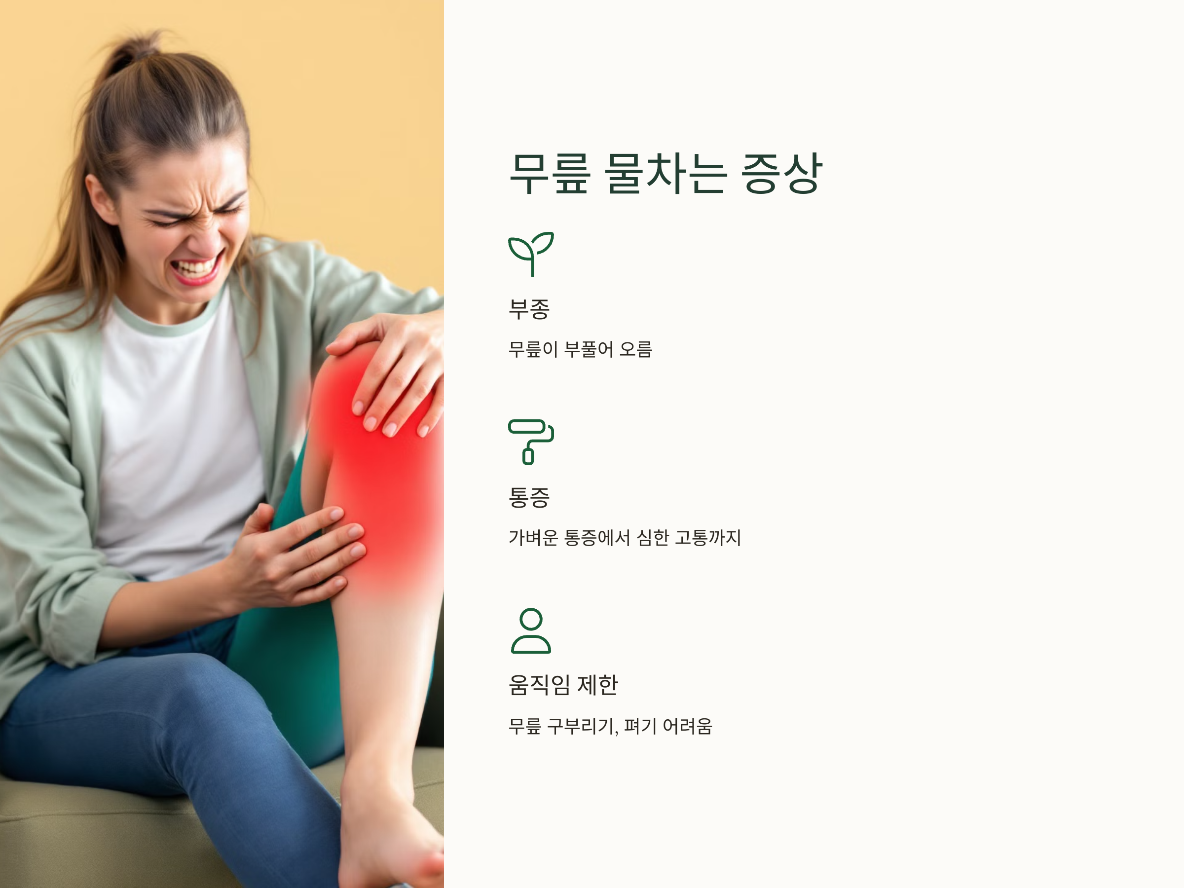 - 열감: 염증이 있을 경우 무릎이 뜨겁게 느껴질 수 있습니다. 이때는 염증 반응이 활발히 진행 중임을 의미합니다.