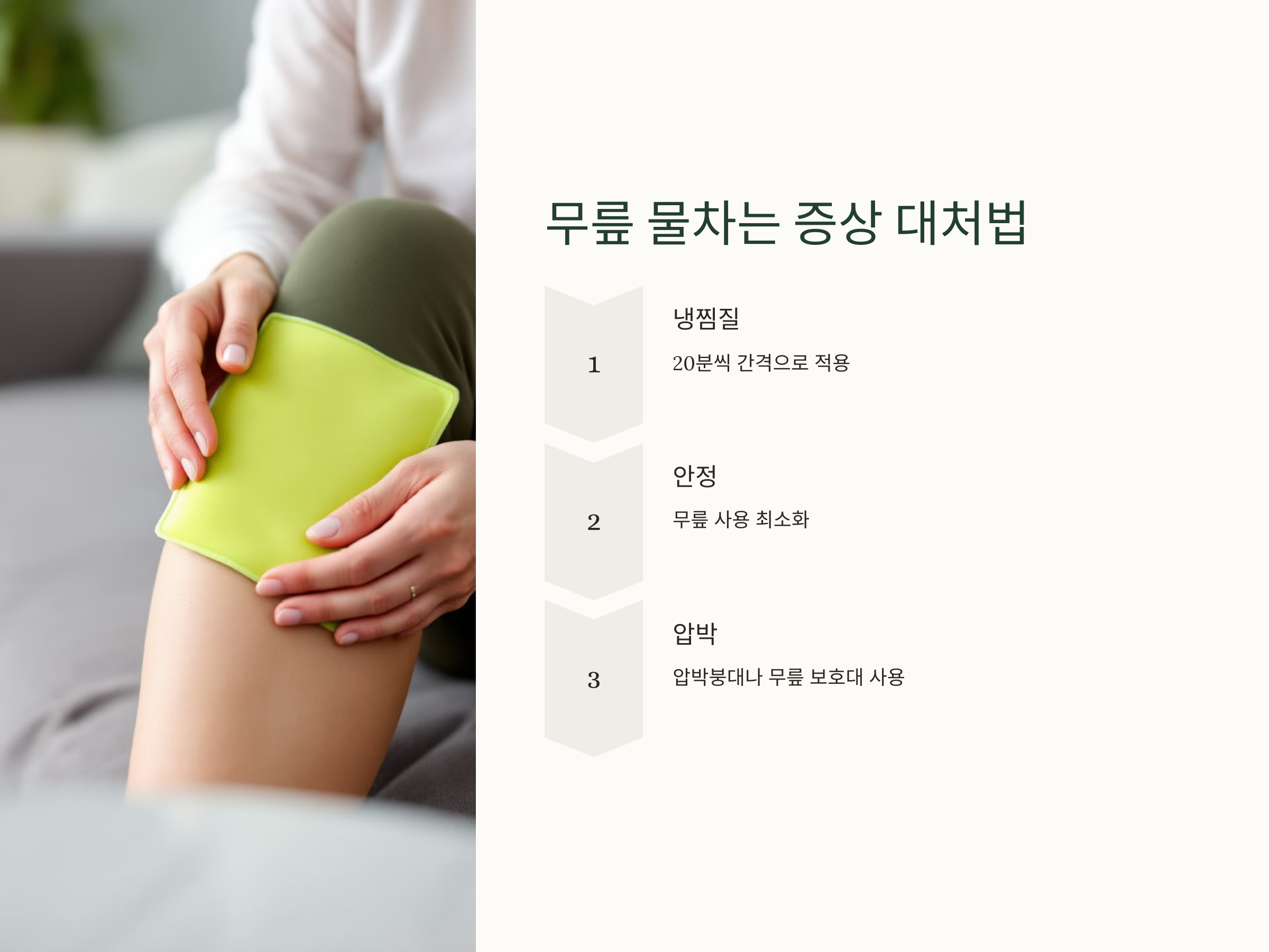 무릎에 물이 차는 증상이 발생했을 때 즉시 대처하는 방법은 다음과 같습니다: