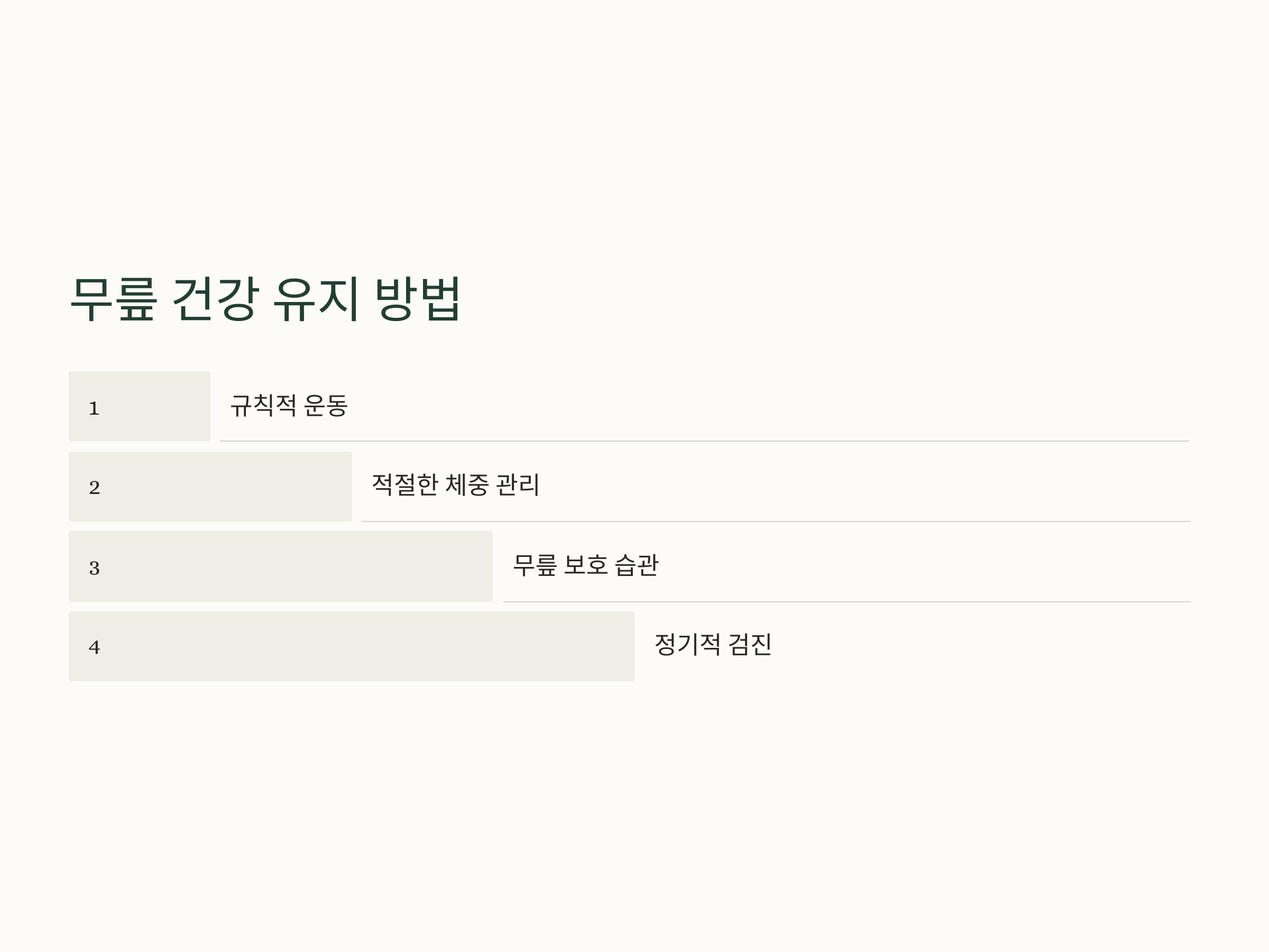 - 운동: 무릎에 부담을 주지 않는 운동을 꾸준히 하면 무릎을 강화시킬 수 있습니다. 특히 근력 운동이 중요합니다.