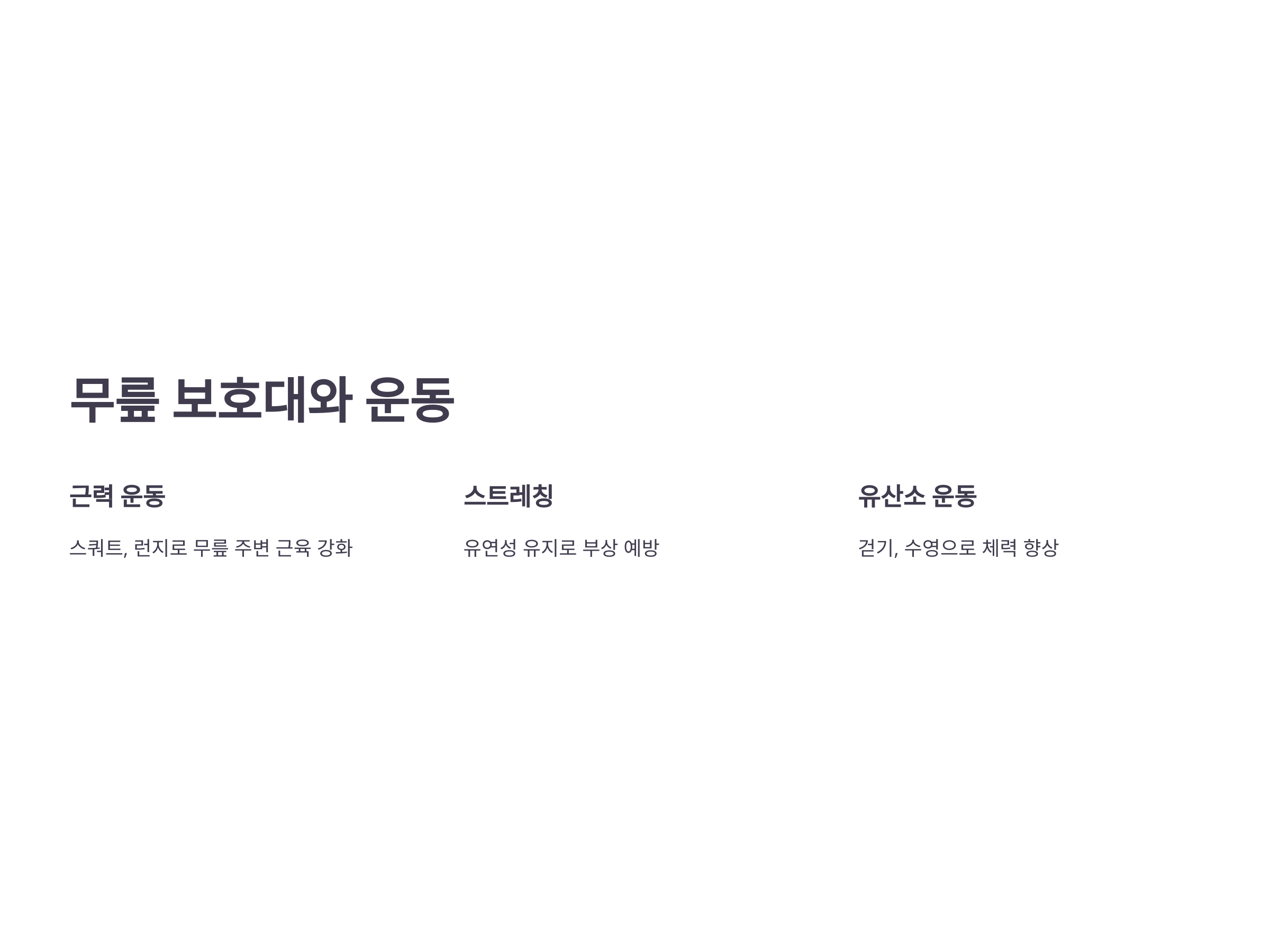 무릎 주변의 근육을 강화하는 운동을 하면 무릎에 가해지는 부담을 줄일 수 있습니다. 스쿼트, 런지, 그리고 레그 프레스 등 하체 근력 운동은 무릎을 안정적으로 지지할 수 있게 도와줍니다.