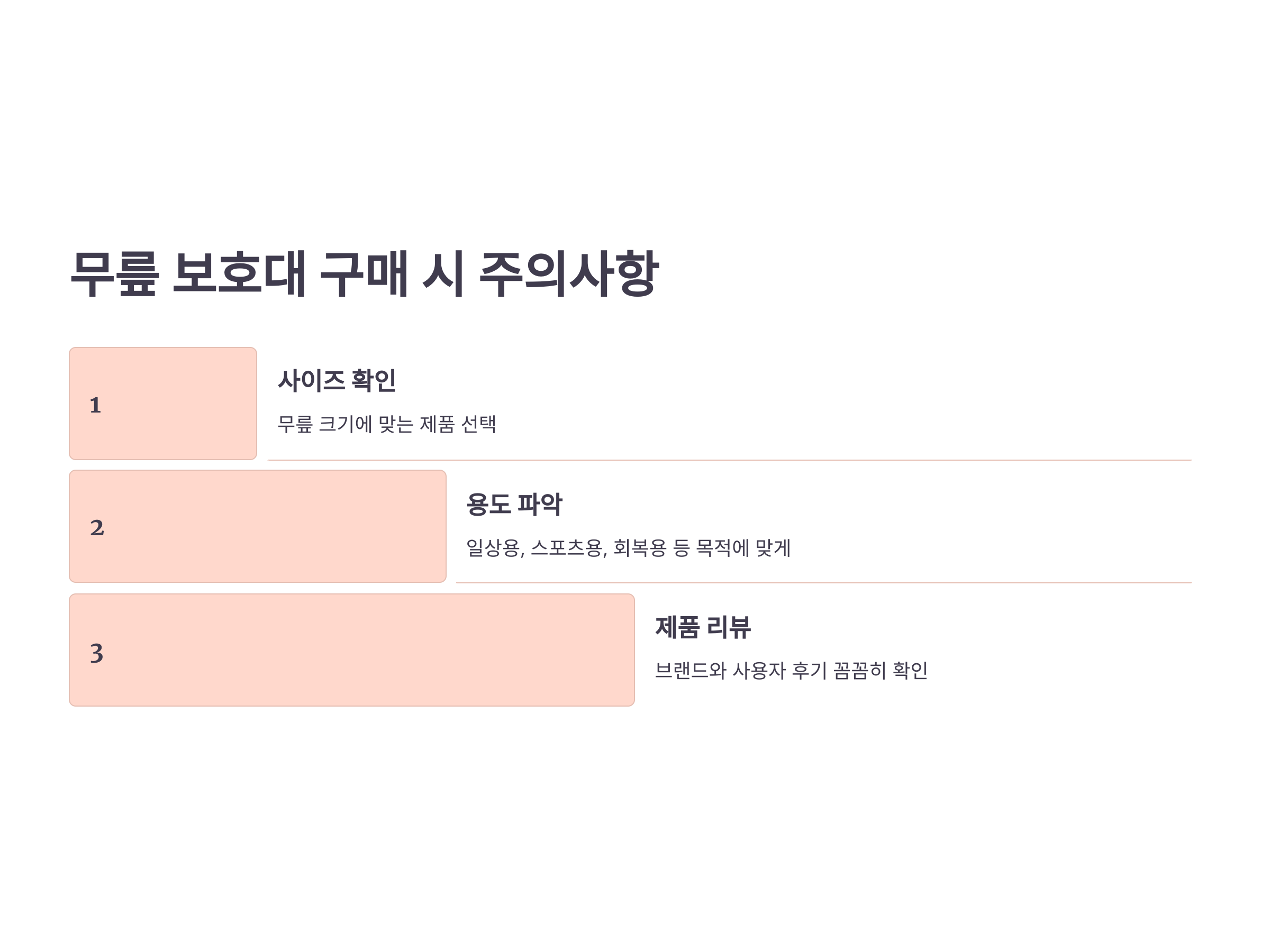 무릎 보호대를 선택할 때 고려해야 할 주요 요소는 다음과 같습니다: