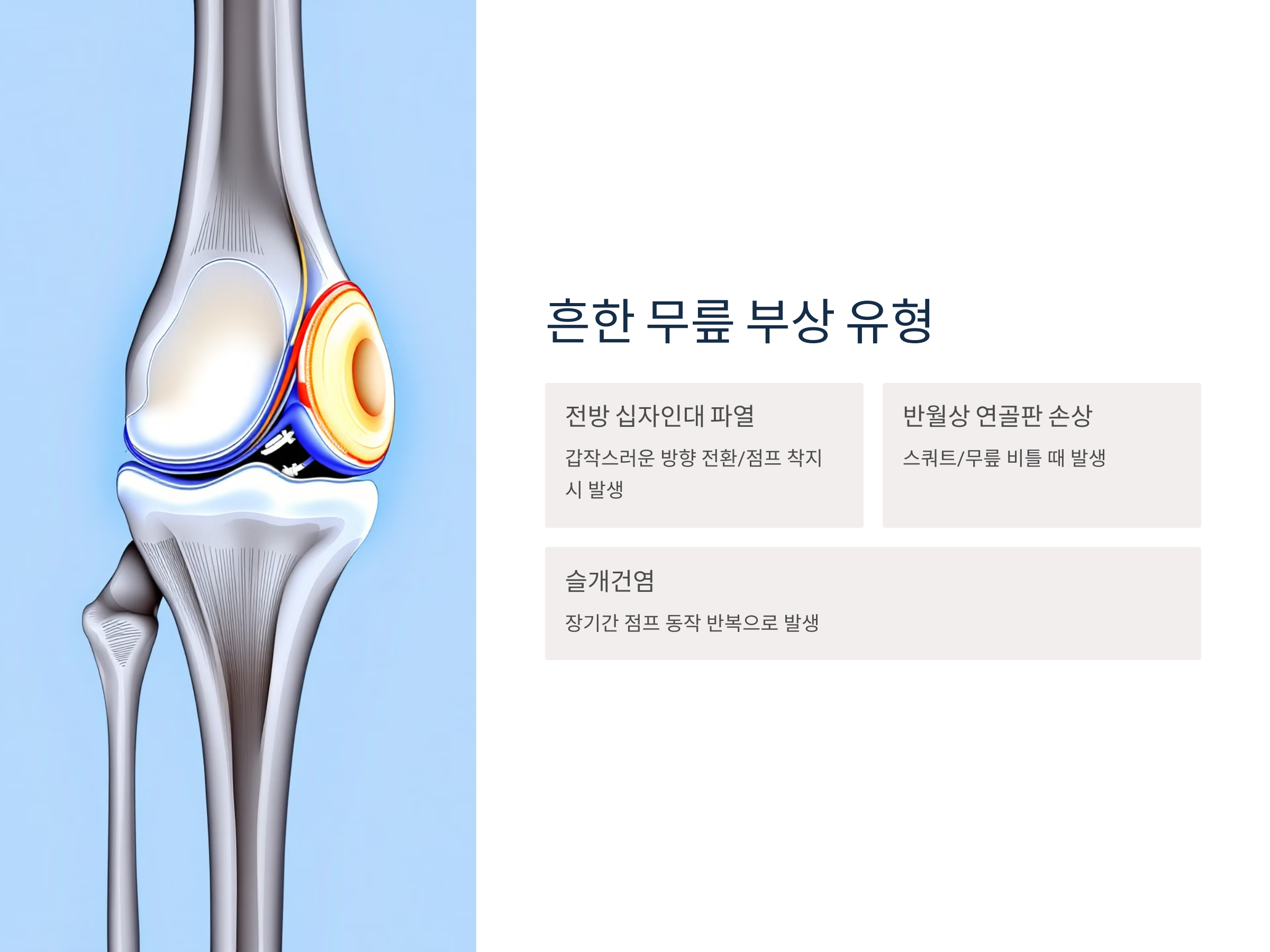 운동 중 발생하는 무릎 부상은 그 원인과 유형에 따라 초기 증상이 다르게 나타날 수 있습니다. 주요 부상 유형은 다음과 같습니다.