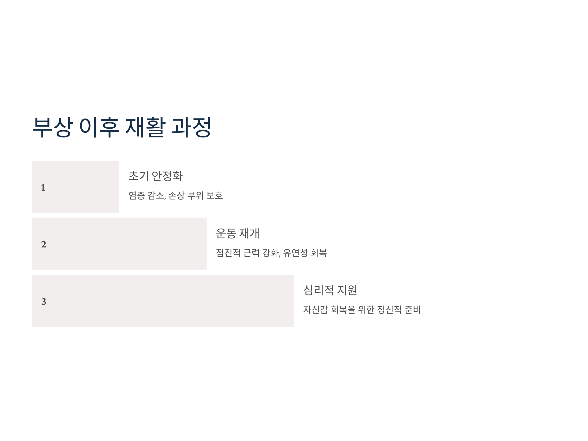 - 운동 재개: 근력 강화와 유연성 회복을 위한 점진적인 운동이 필요합니다.