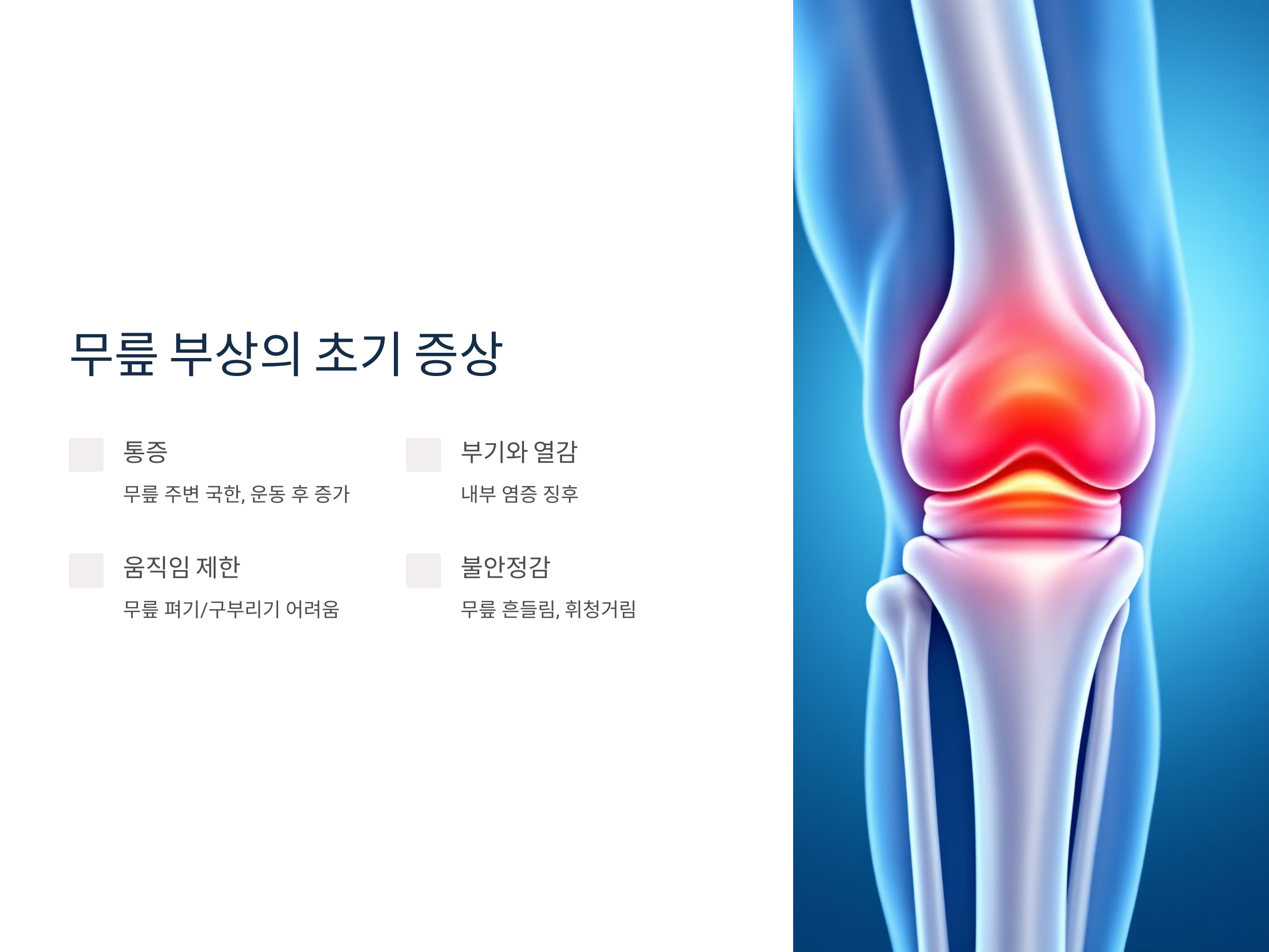 - 움직임 제한: 무릎을 완전히 펴거나 구부리는 것이 어려워지는 증상도 초기 신호 중 하나입니다.