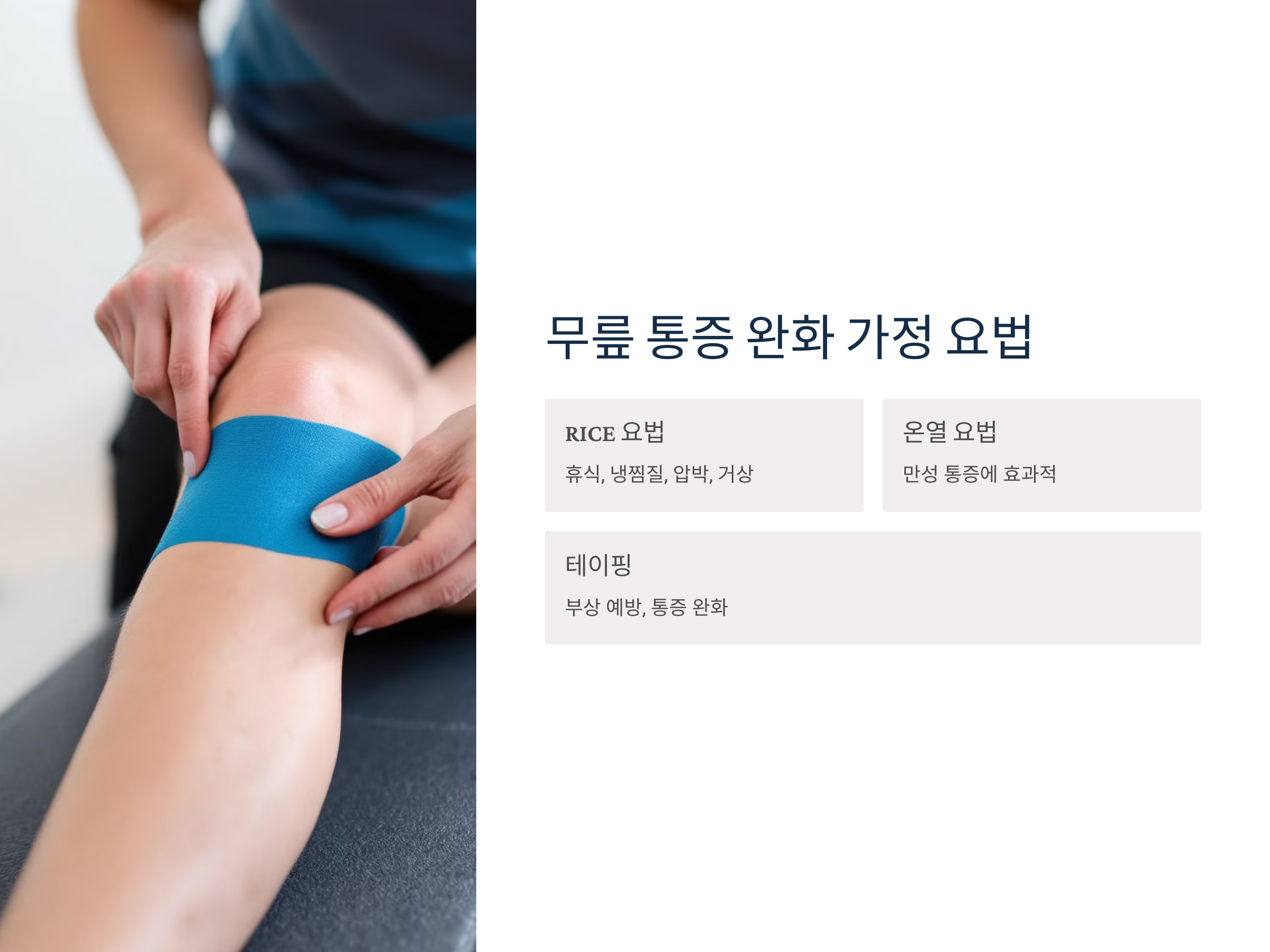 - 테이핑: 무릎 주위에 테이핑을 하여 부상을 예방하고 통증을 완화합니다.