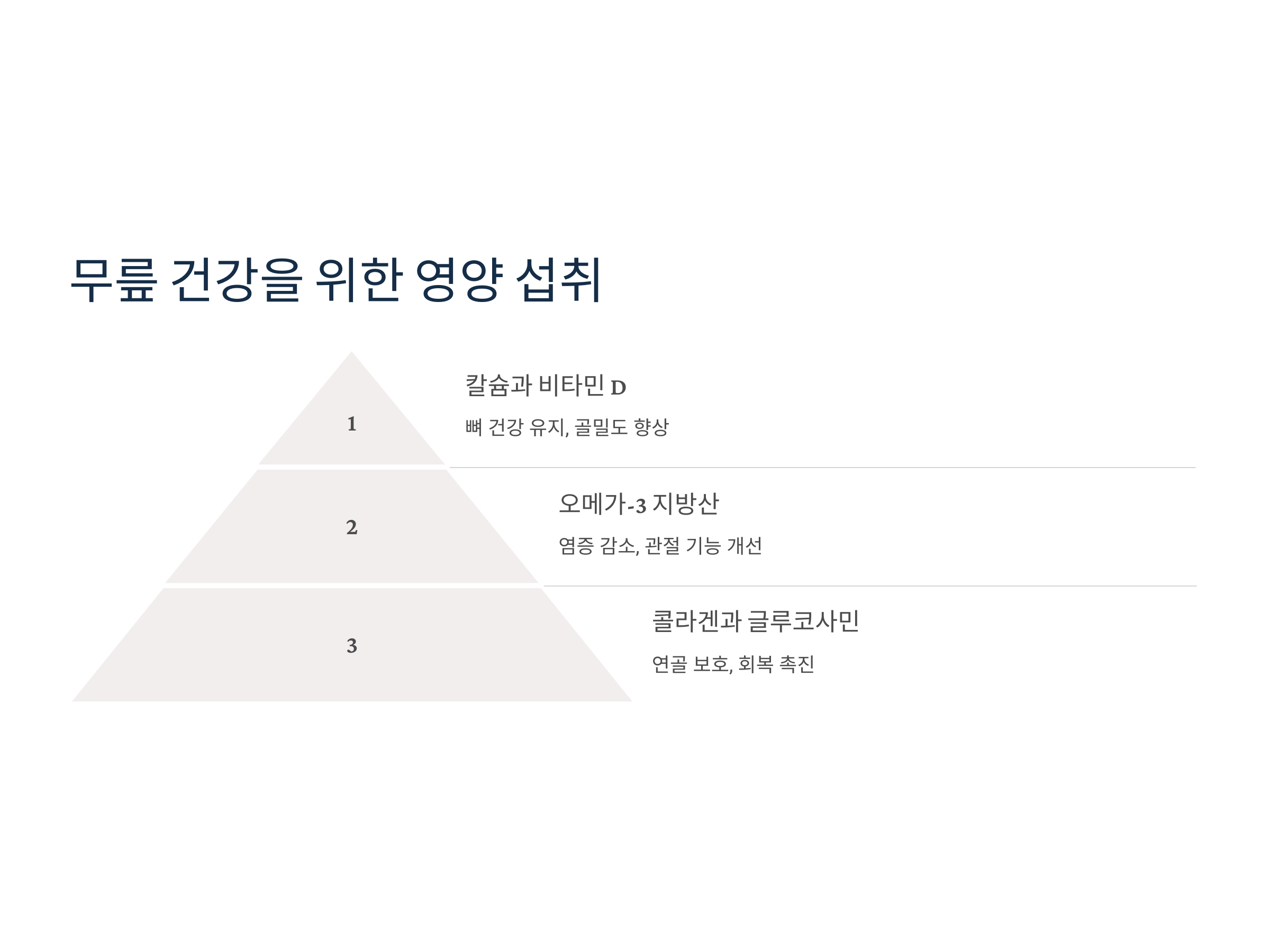 무릎 관절 건강을 위해서는 운동뿐만 아니라 올바른 식단 관리도 필수입니다. 관절 건강에 도움을 주는 영양소는 다음과 같습니다.