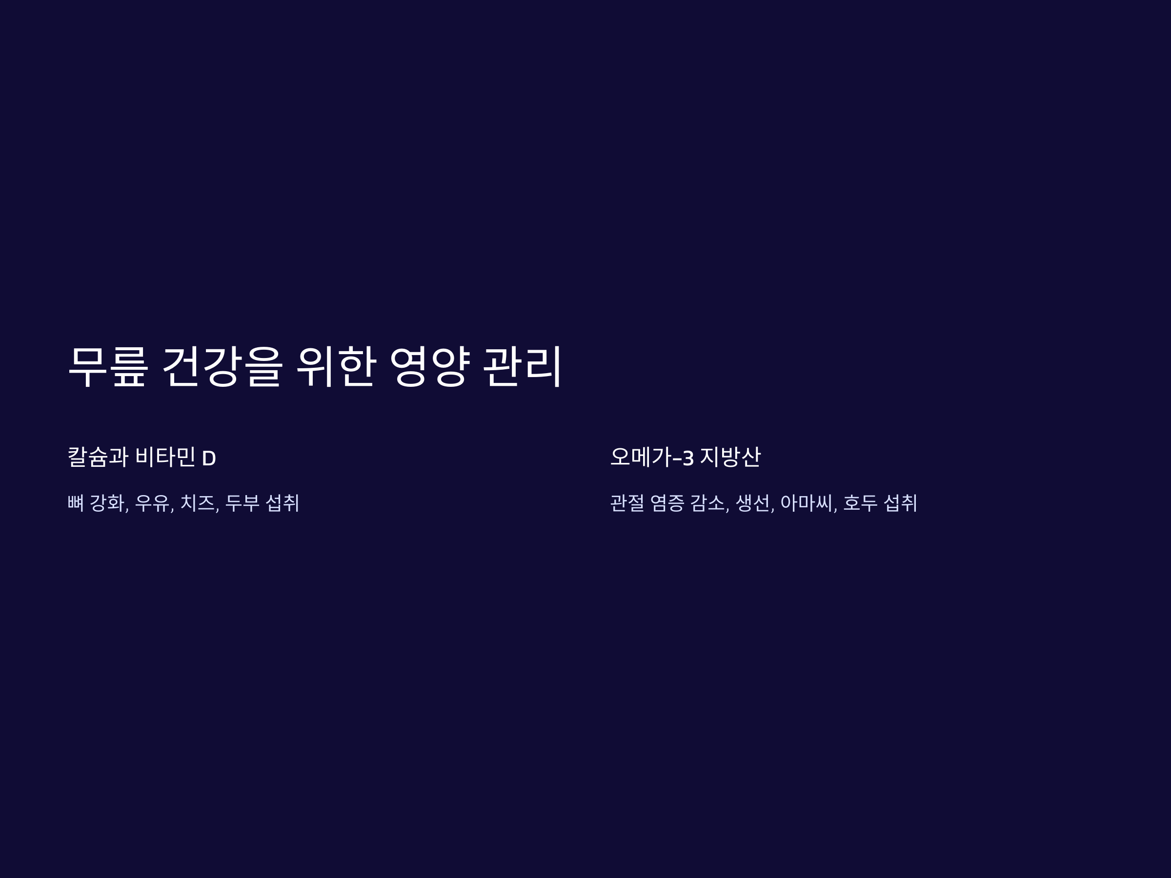 영양도 무릎 건강에 중요한 영향을 미칩니다. 특히 관절을 보호하는 영양소를 충분히 섭취하는 것이 부상을 예방하는 데 도움이 됩니다. 관절에 좋은 영양소와 음식을 알아보겠습니다.