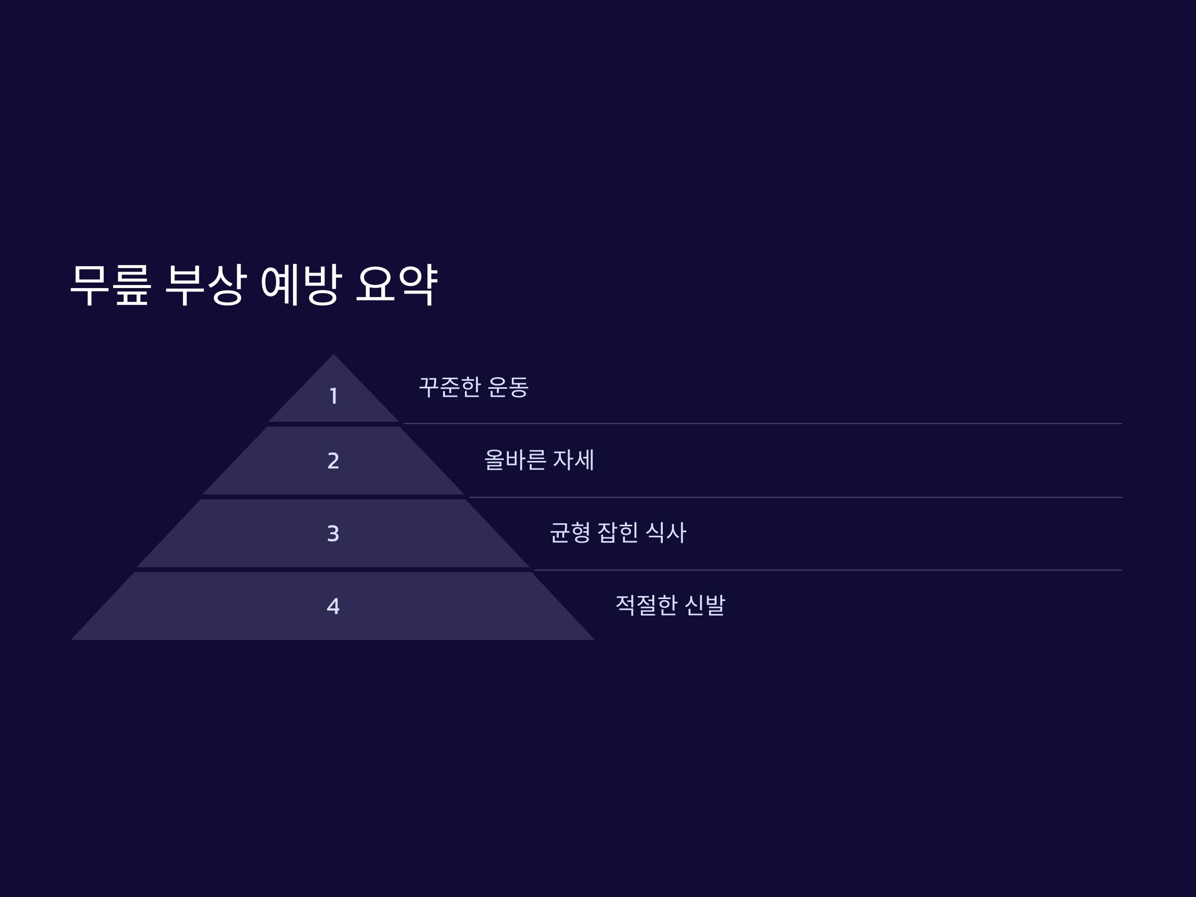 무릎 부상을 예방하는 가장 중요한 방법은 꾸준한 운동과 건강한 생활습관을 유지하는 것입니다. 올바른 운동법과 스트레칭을 통해 무릎 주변 근육을 강화하고, 균형 잡힌 식사를 통해 무릎을 보호하는 것이 중요합니다. 또한, 일상에서 무릎에 부담을 주지 않는 자세를 유지하며, 적절한 신발을 착용하는 것도 큰 도움이 됩니다. 무릎 부상을 예방하려면 꾸준한 관리가 필요합니다.