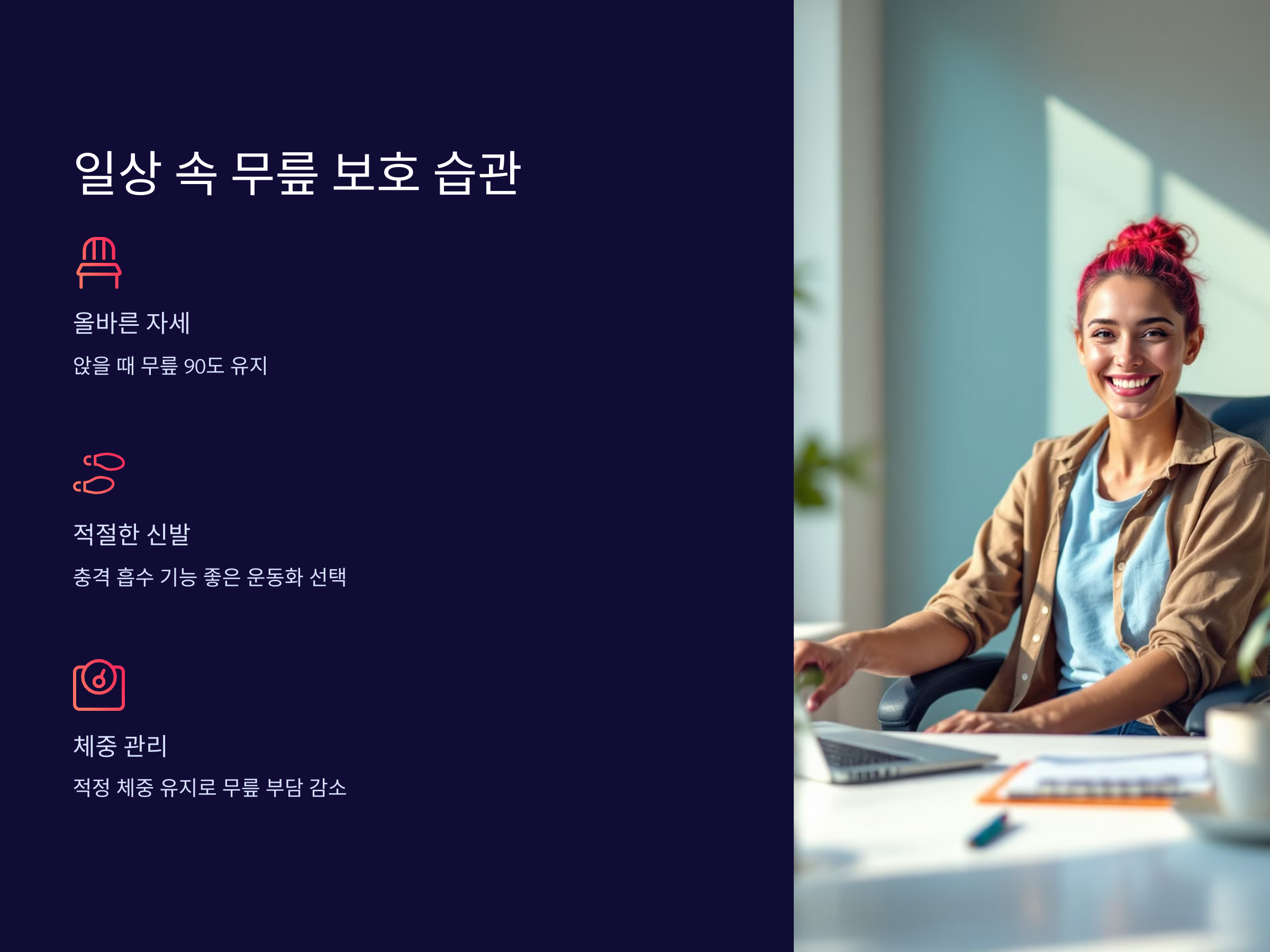 운동 외에도 일상 생활에서 무릎을 보호하는 습관을 기르는 것이 중요합니다. 특히 바른 자세와 생활습관을 통해 무릎에 가해지는 스트레스를 줄일 수 있습니다.