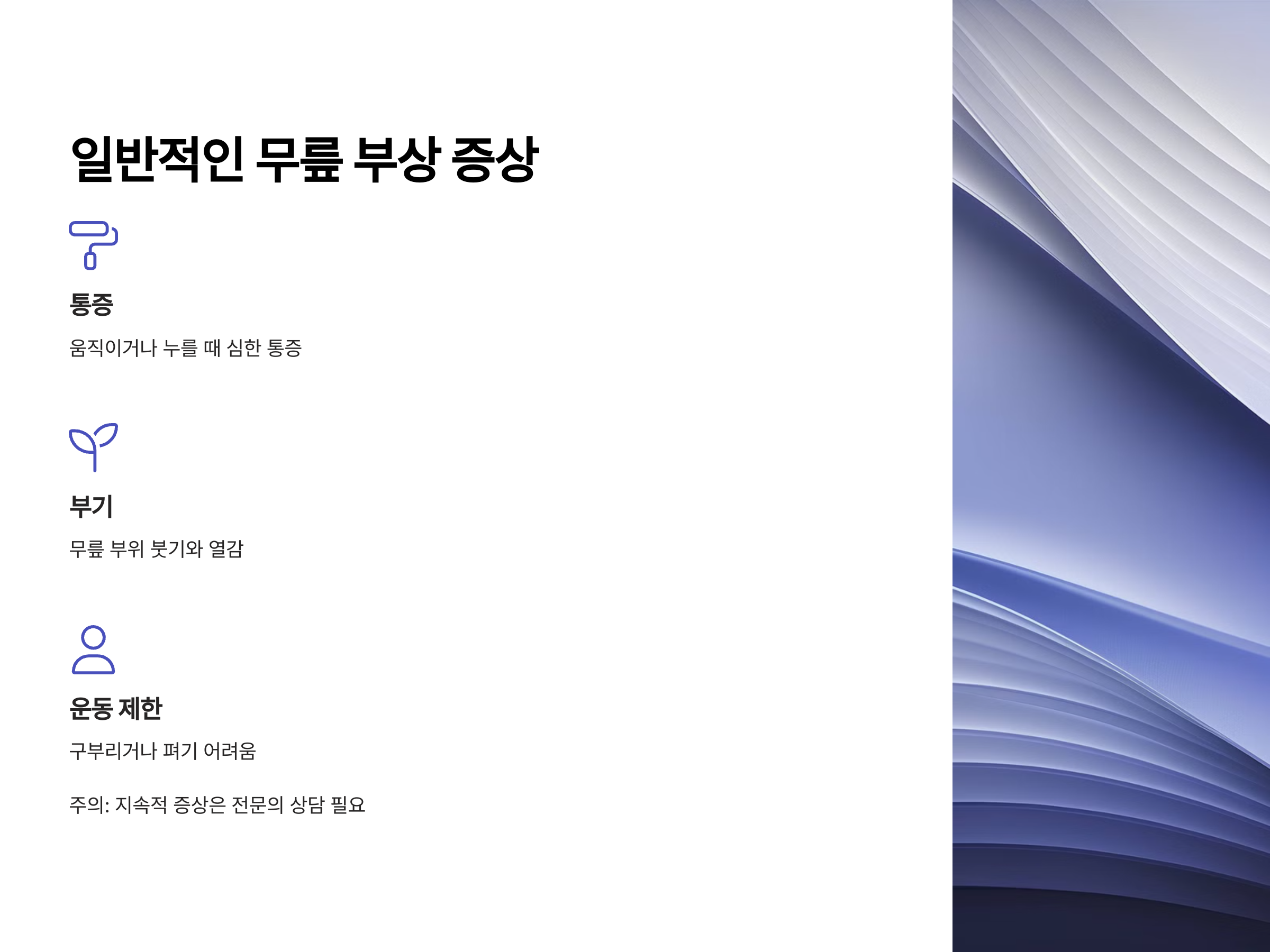 - 운동 제한: 무릎을 구부리거나 펼 때 어려움을 겪습니다.