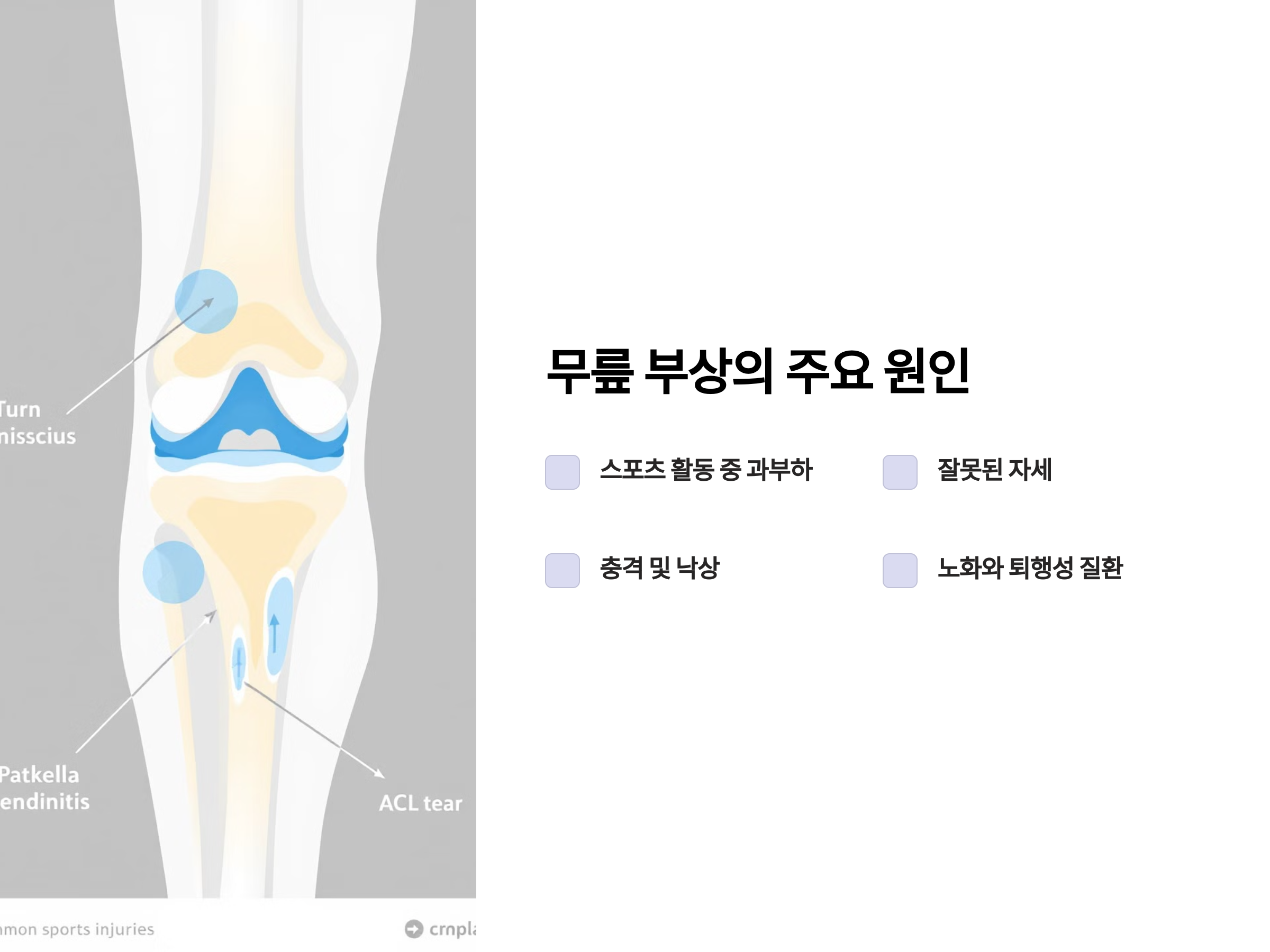 - 반월상 연골판 손상: 체중이 실린 상태에서 무릎이 비틀어질 때 발생합니다.