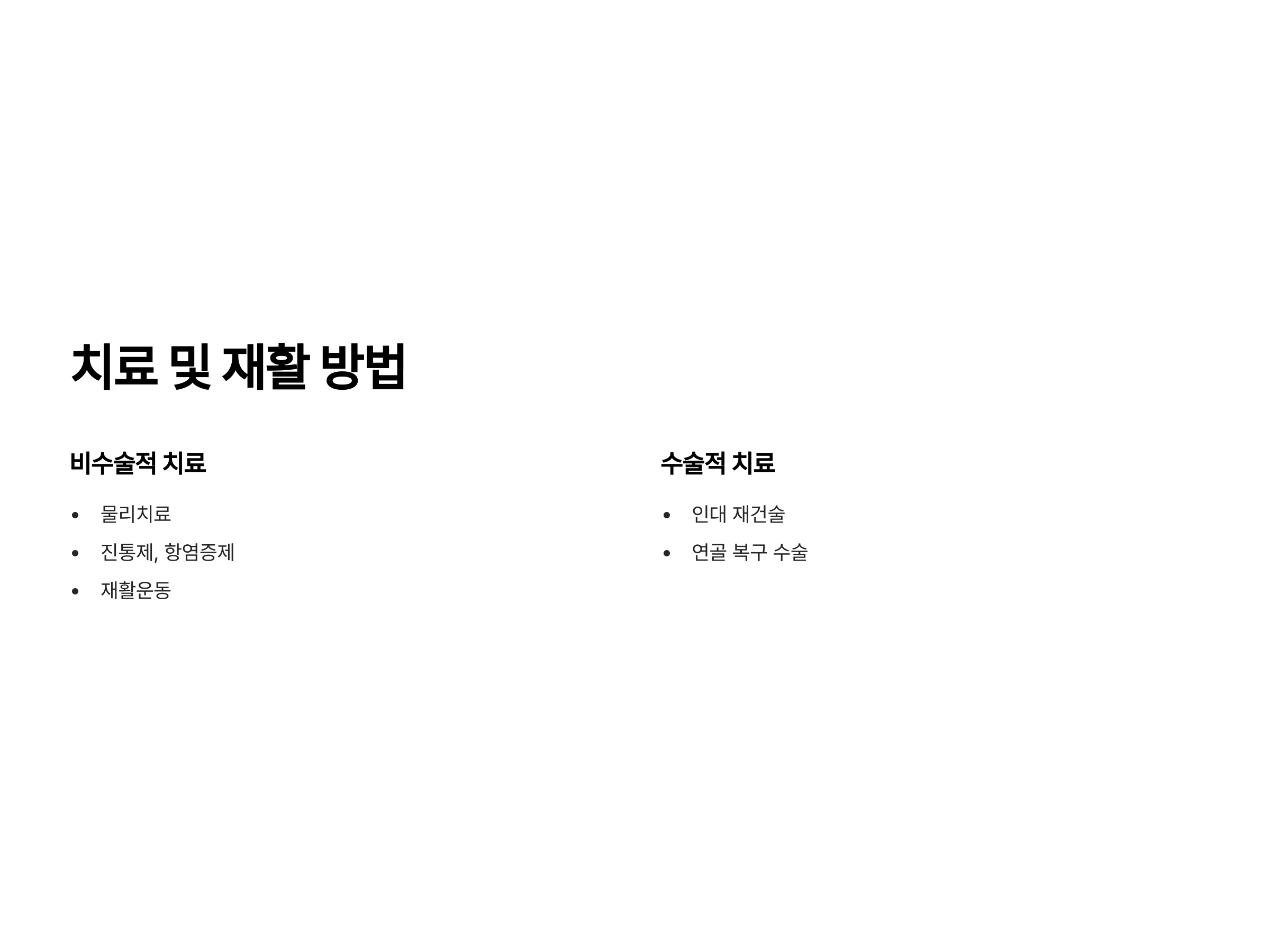- 비수술적 치료: 물리치료, 진통제 및 항염증제 복용, 재활운동 등이 포함됩니다.