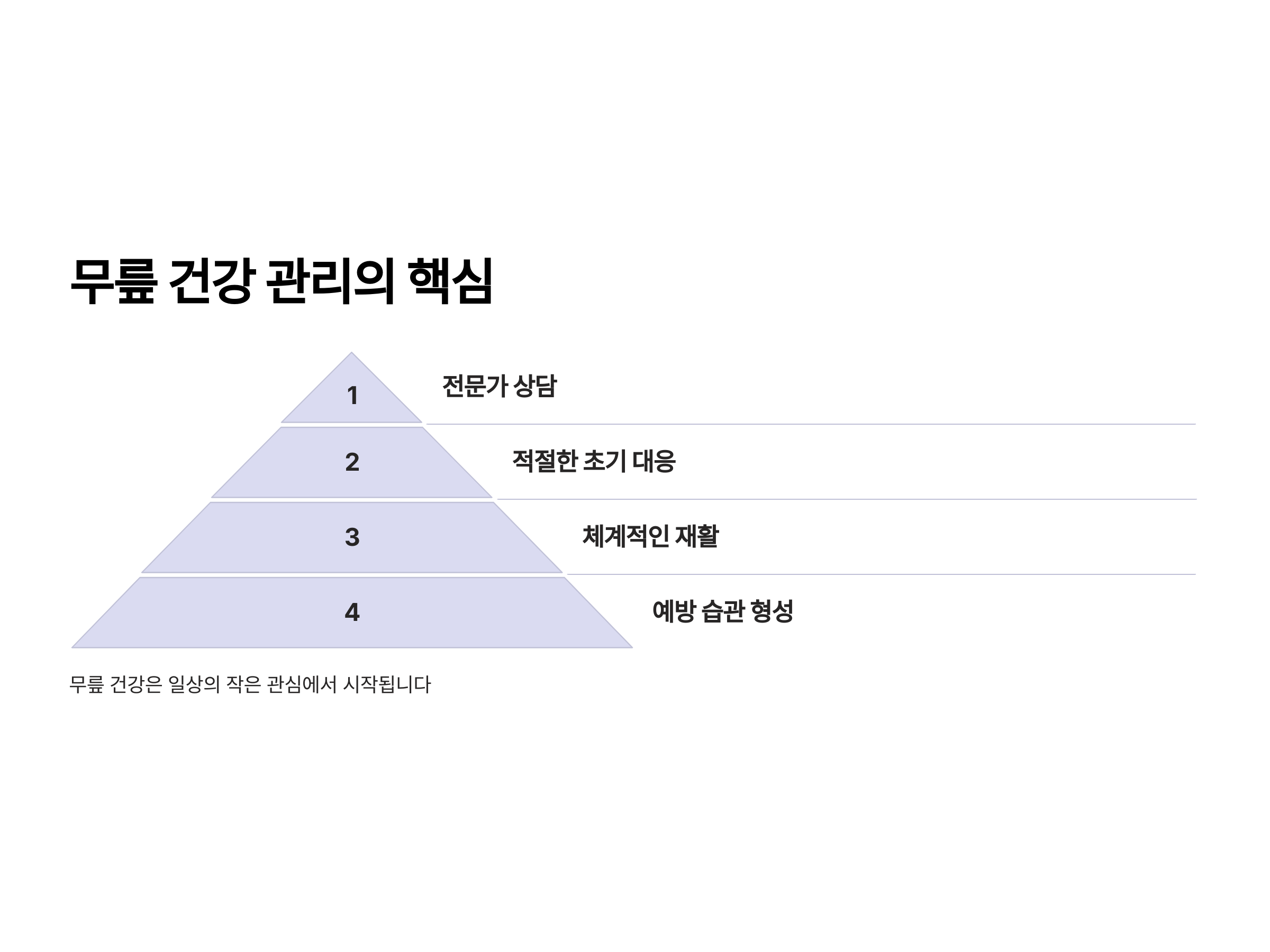 무릎 부상의 치료 및 관리는 전문가의 도움을 받는 것이 가장 중요합니다. 신뢰할 수 있는 병원을 선택하고 필요시 전문 치료센터의 도움을 받으세요.