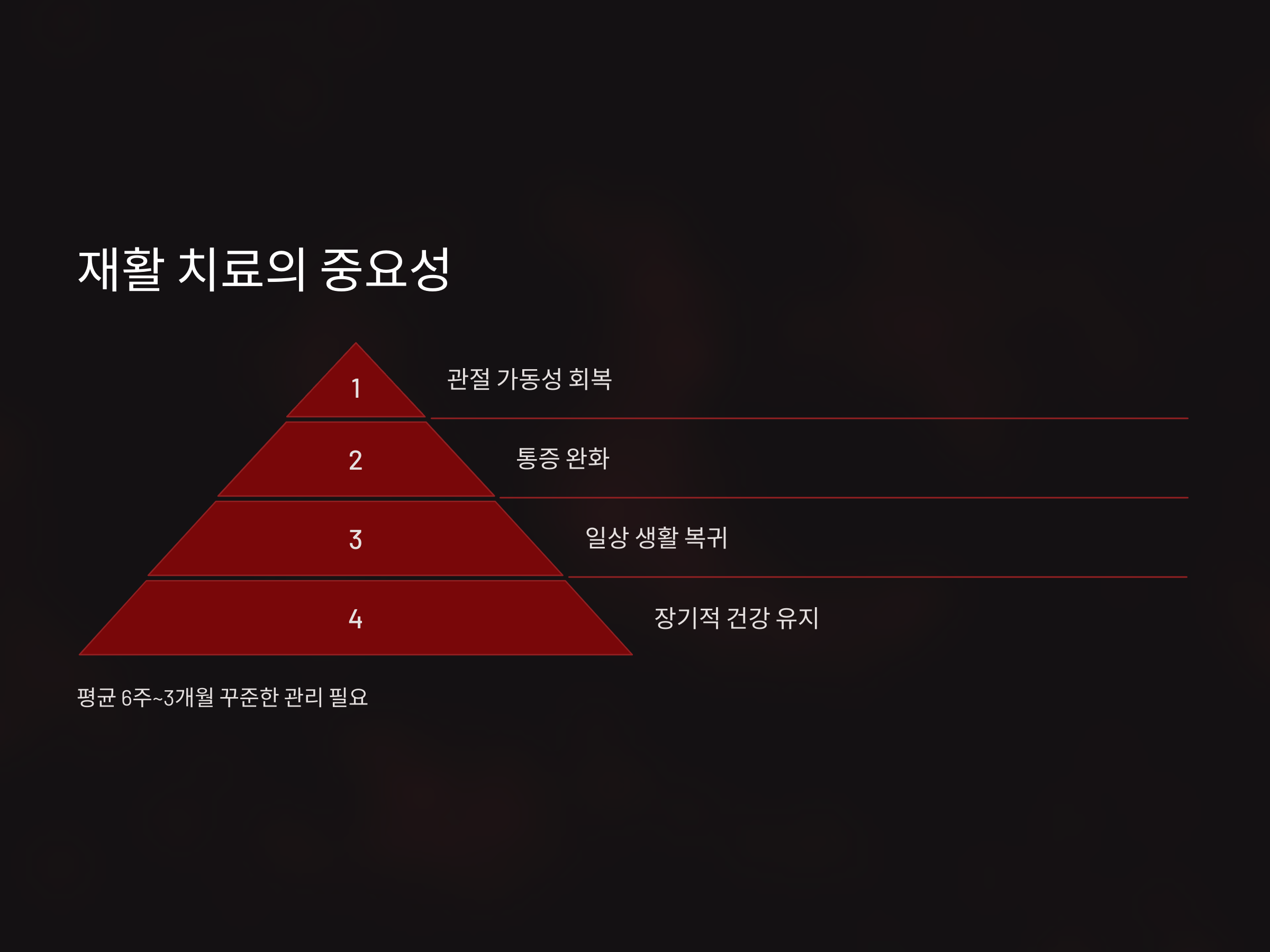 - 관절 가동성을 회복하고 통증 완화를 도모합니다.