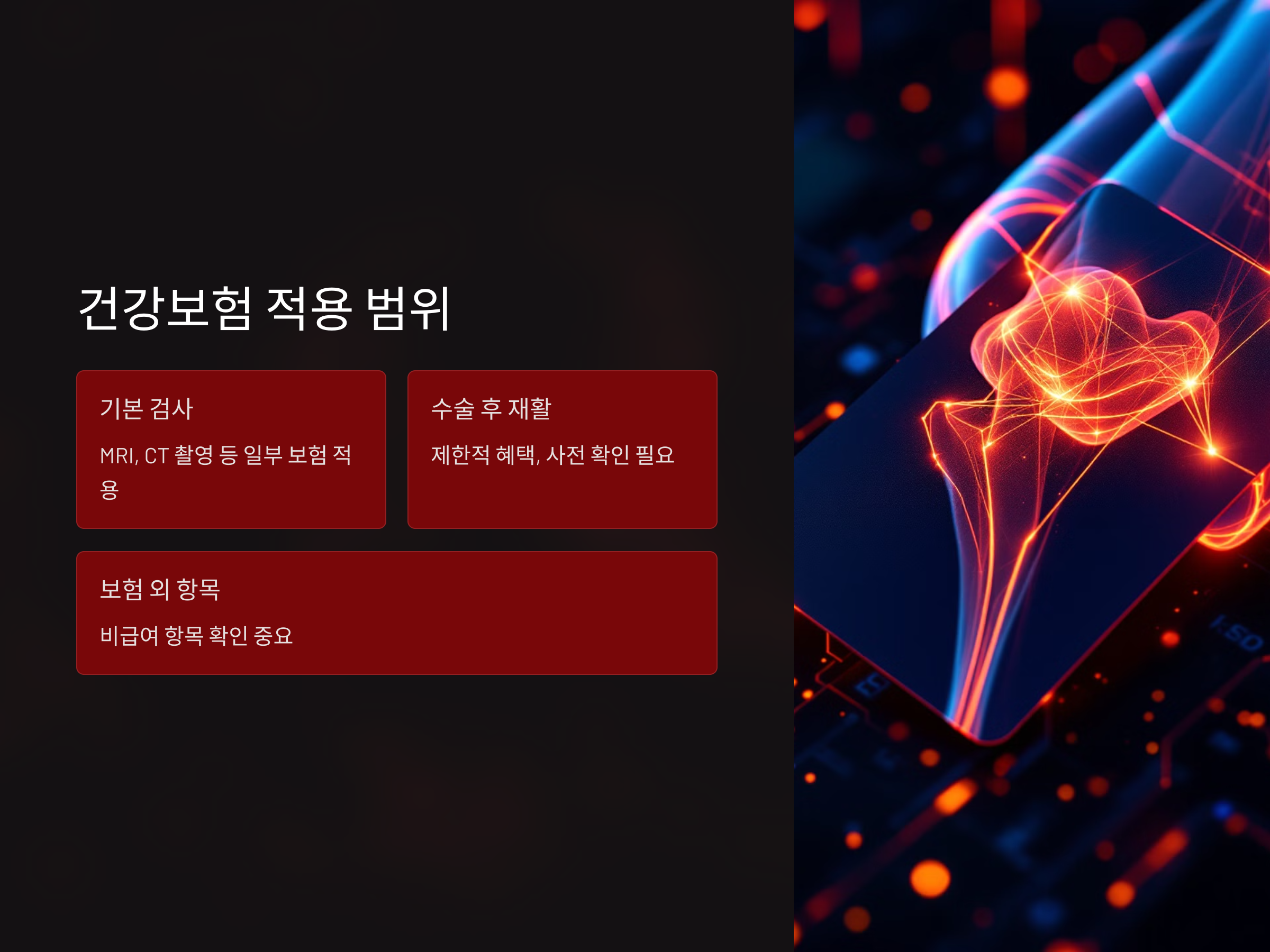 - 수술 후 재활: 제한적 혜택이 제공되므로 사전 확인이 필요합니다.