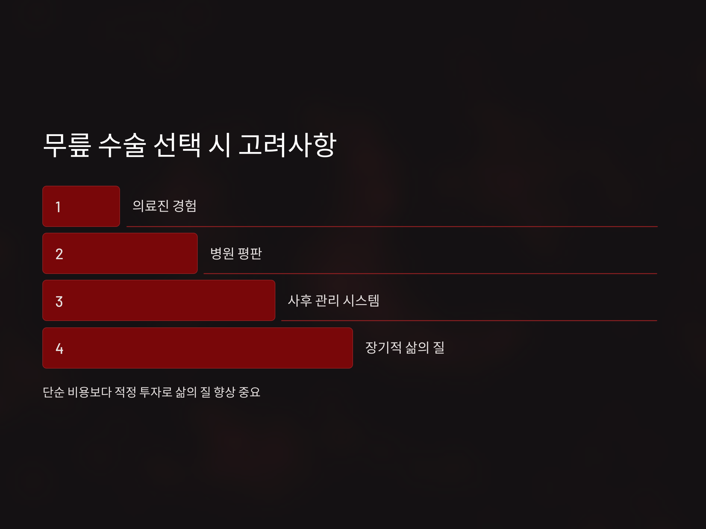 무릎 수술의 종류와 병원을 선택할 때는 비용뿐만 아니라 장기적인 결과를 고려해야 합니다.
