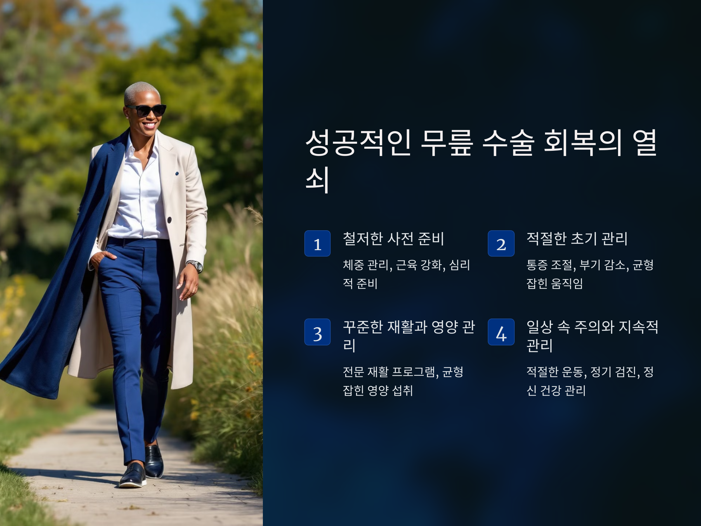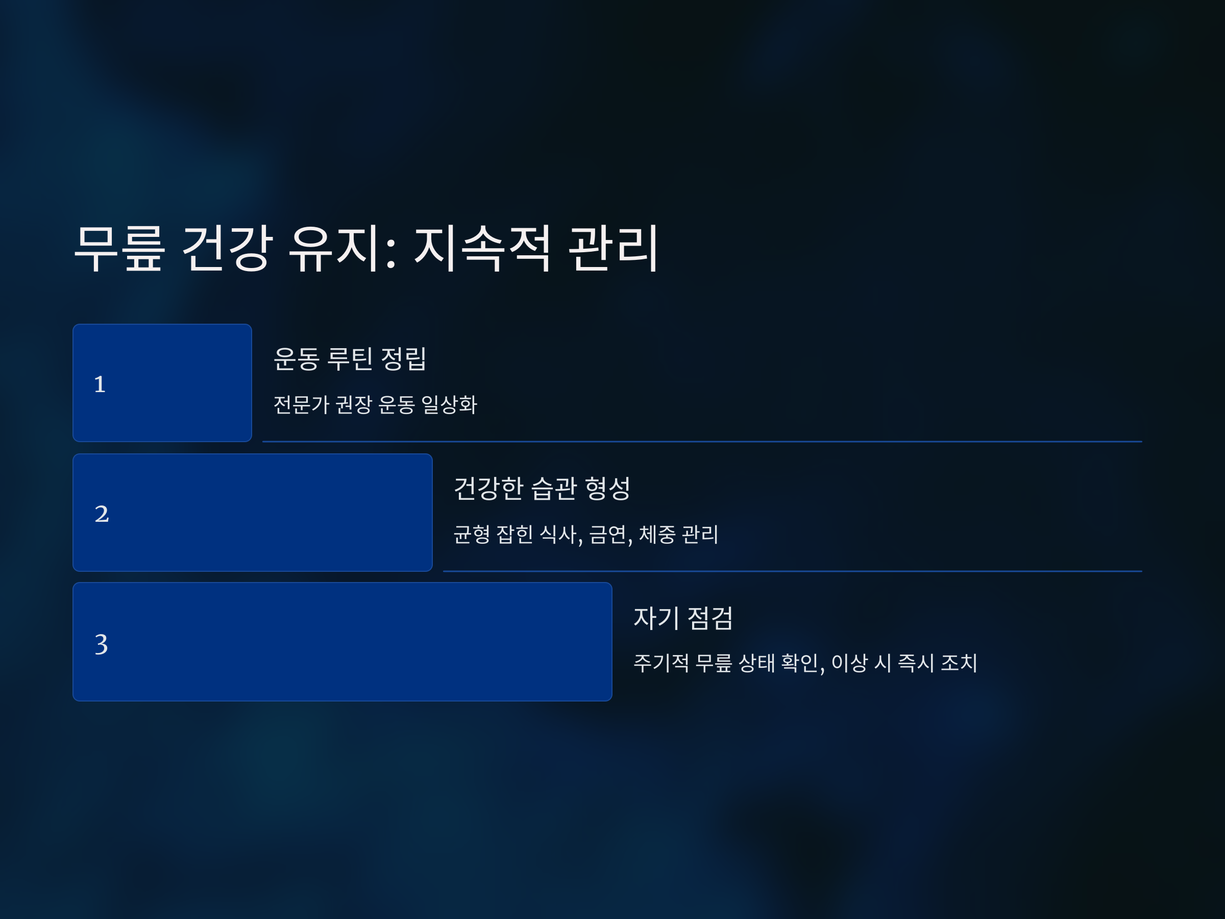 균형 잡힌 식사, 금연, 적절한 체중 관리 등의 습관을 유지하여 무릎뿐 아니라 전반적인 건강을 지키세요.