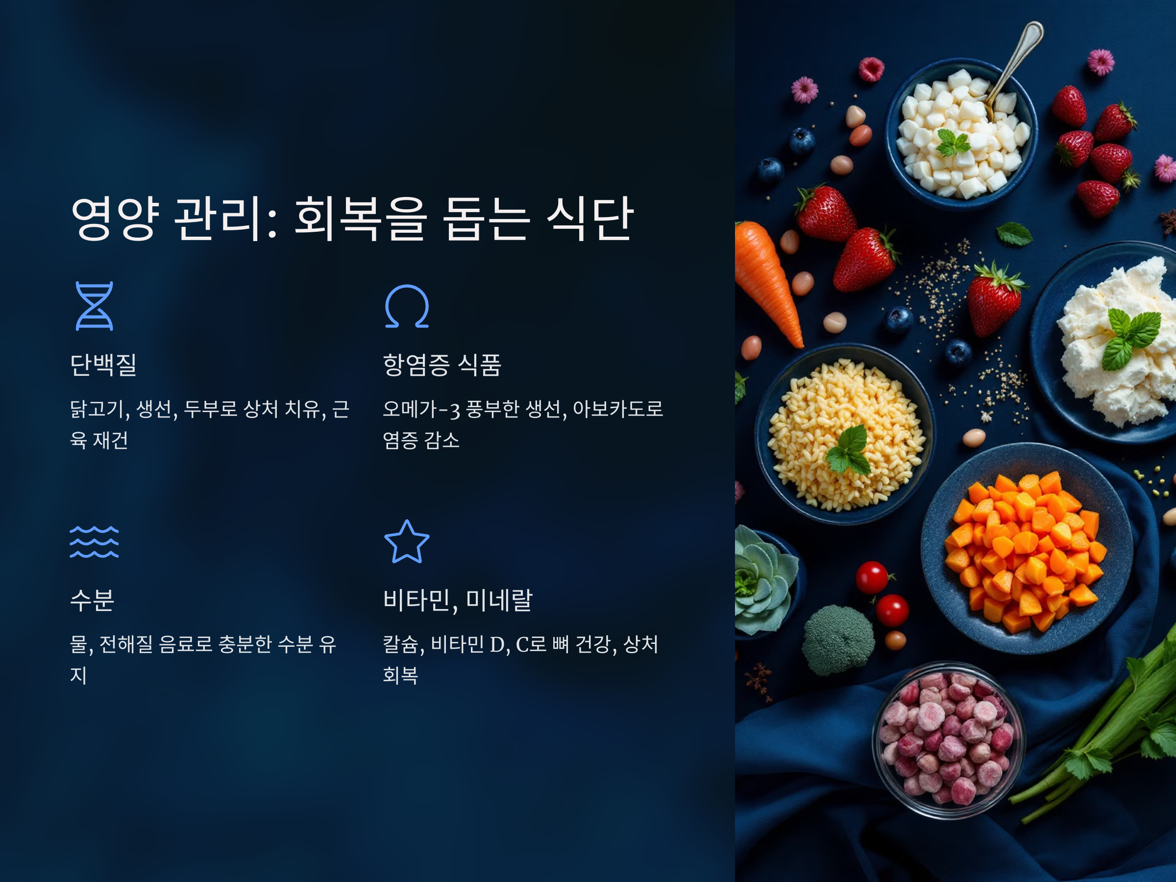 상처 치유와 근육 재건을 위해 단백질이 풍부한 음식을 섭취하세요. 닭고기, 생선, 두부, 콩류 등이 좋은 선택입니다.