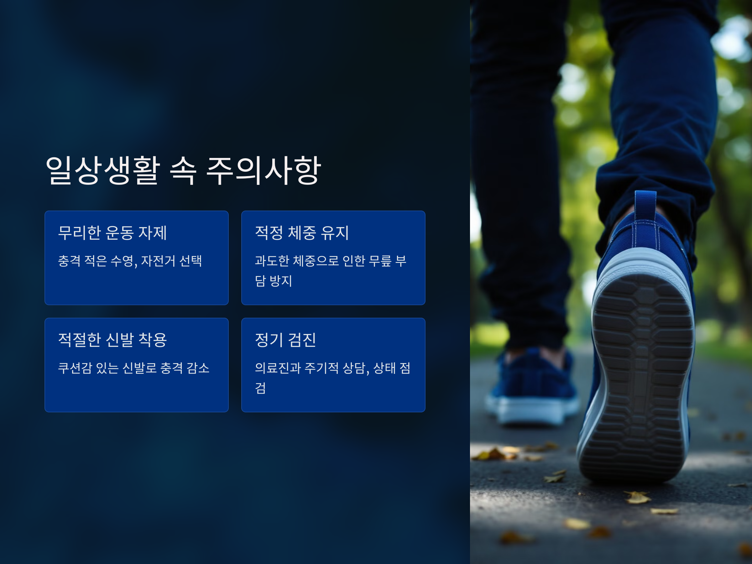 무릎 상태를 주기적으로 확인하고, 이상이 있으면 즉시 조치를 취하세요.