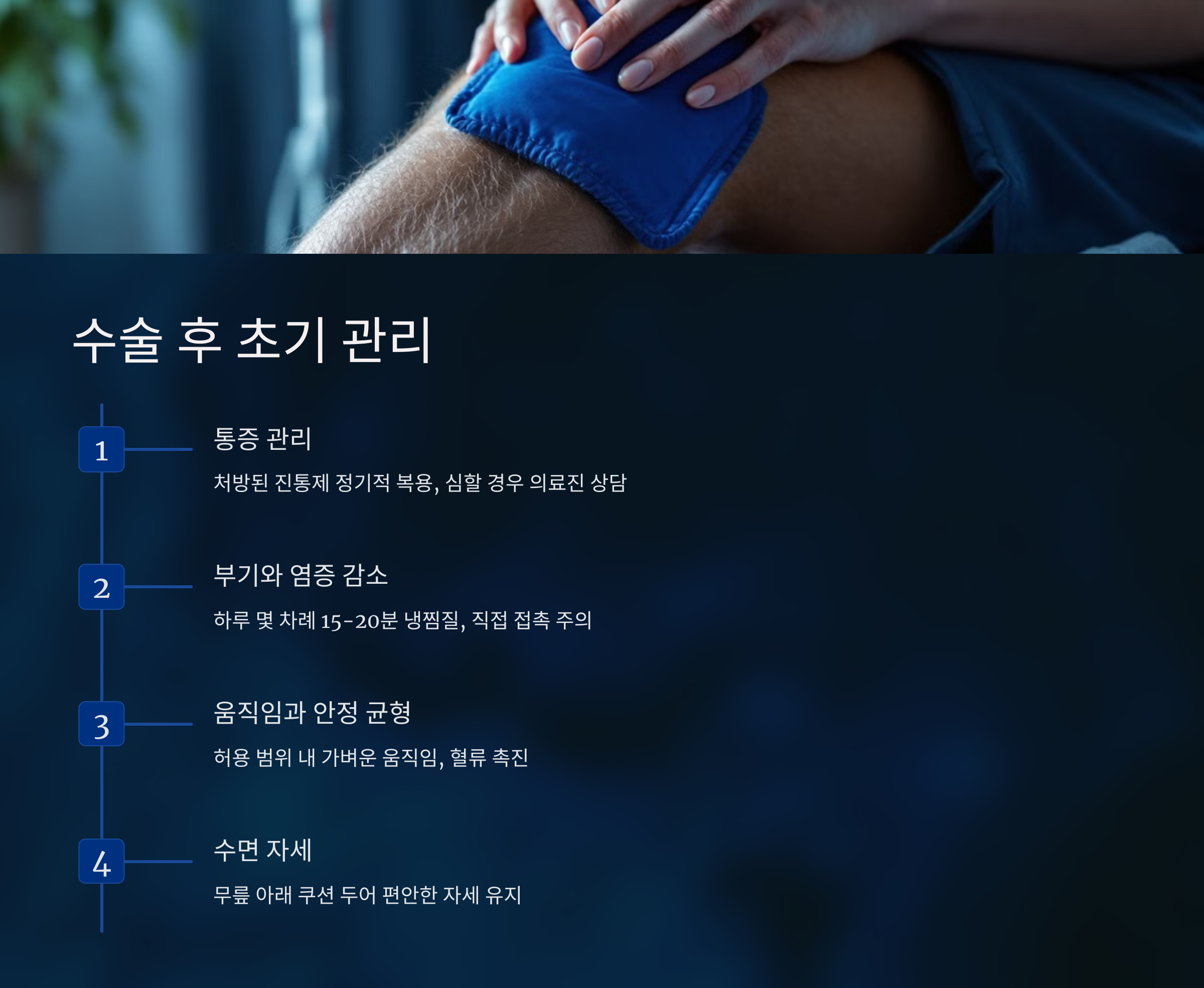 수술 직후에는 무릎을 최대한 안정시키는 것이 중요하지만, 의료진이 허용하는 범위 내에서 가벼운 움직임을 시작해야 혈류를 촉진하고 혈전 위험을 줄일 수 있습니다.
