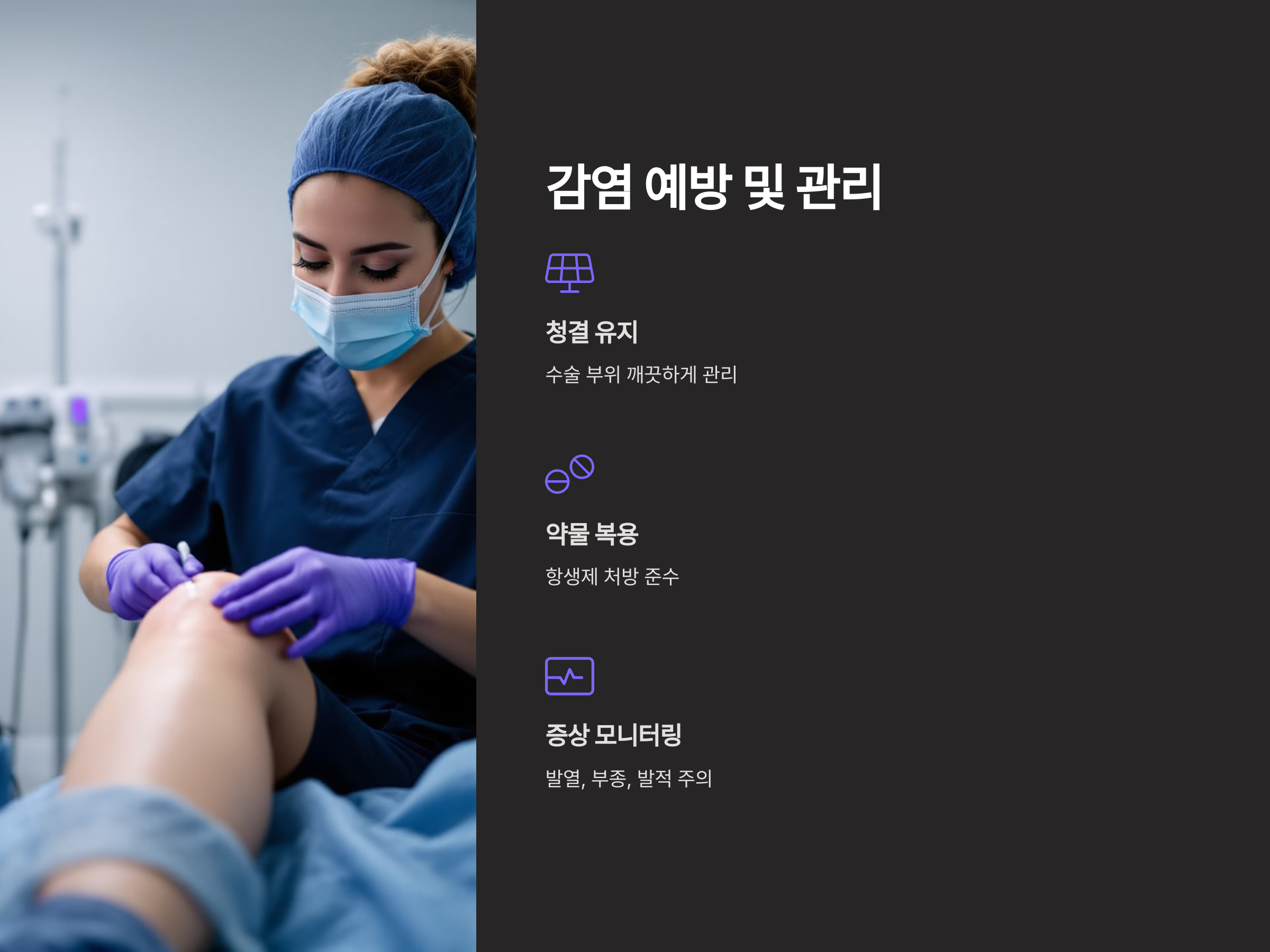 - 청결 유지: 수술 부위를 깨끗하게 관리하고, 의사의 지시에 따라 소독을 철저히 해야 합니다.