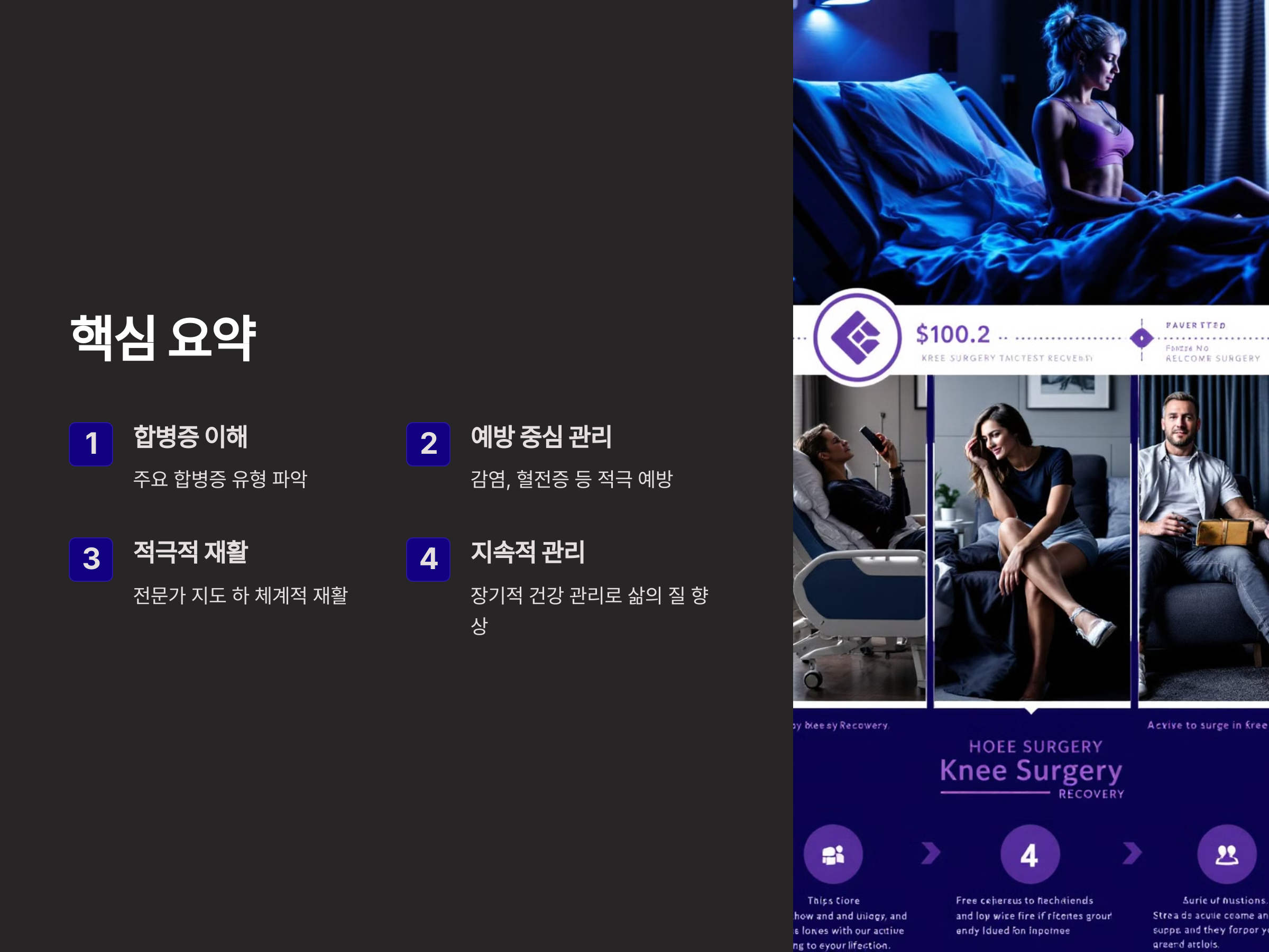 릎 수술은 관절염, 외상, 또는 기타 질환으로 인해 손상된 무릎을 회복하는 데 중요한 치료 방법입니다. 하지만 수술 이후 발생할 수 있는 합병증에 대한 이해와 예방은 성공적인 회복을 위해 필수적입니다. 본 포스팅에서는 무릎 수술 후 발생할 수 있는 주요 합병증과 이를 예방하고 관리하는 방법을 알아보겠습니다.