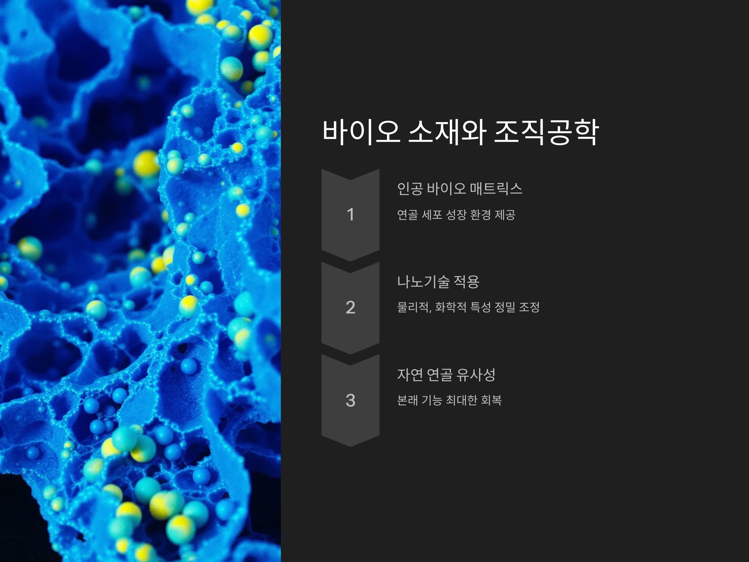 바이오 소재와 조직공학 기술은 연골 재생 치료의 또 다른 축입니다. 인공 바이오 매트릭스를 이용해 연골 세포가 자랄 수 있는 환경을 제공하며, 손상 부위에 적합한 구조를 설계해 자연 연골과 유사한 조직을 형성합니다.