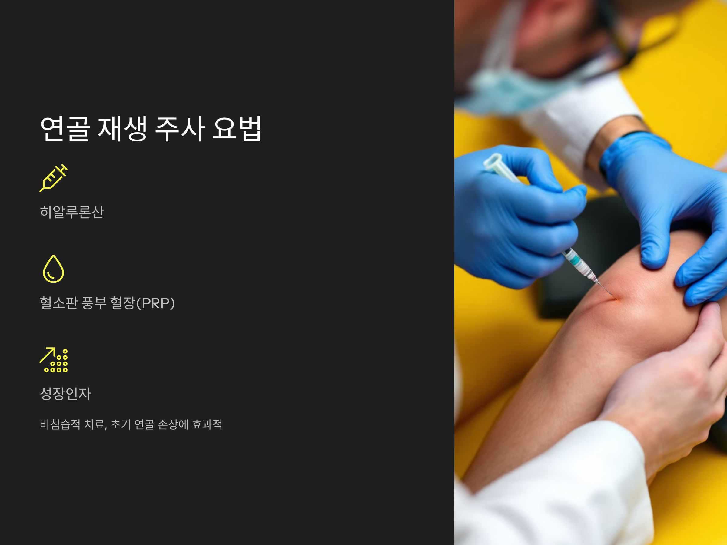 연골 재생 주사는 간단한 주입만으로 치료가 가능해 비침습적 방법을 선호하는 환자들에게 적합한 옵션입니다. 주사에는 히알루론산, 혈소판 풍부 혈장(PRP), 성장인자 등을 포함한 다양한 물질이 사용됩니다.