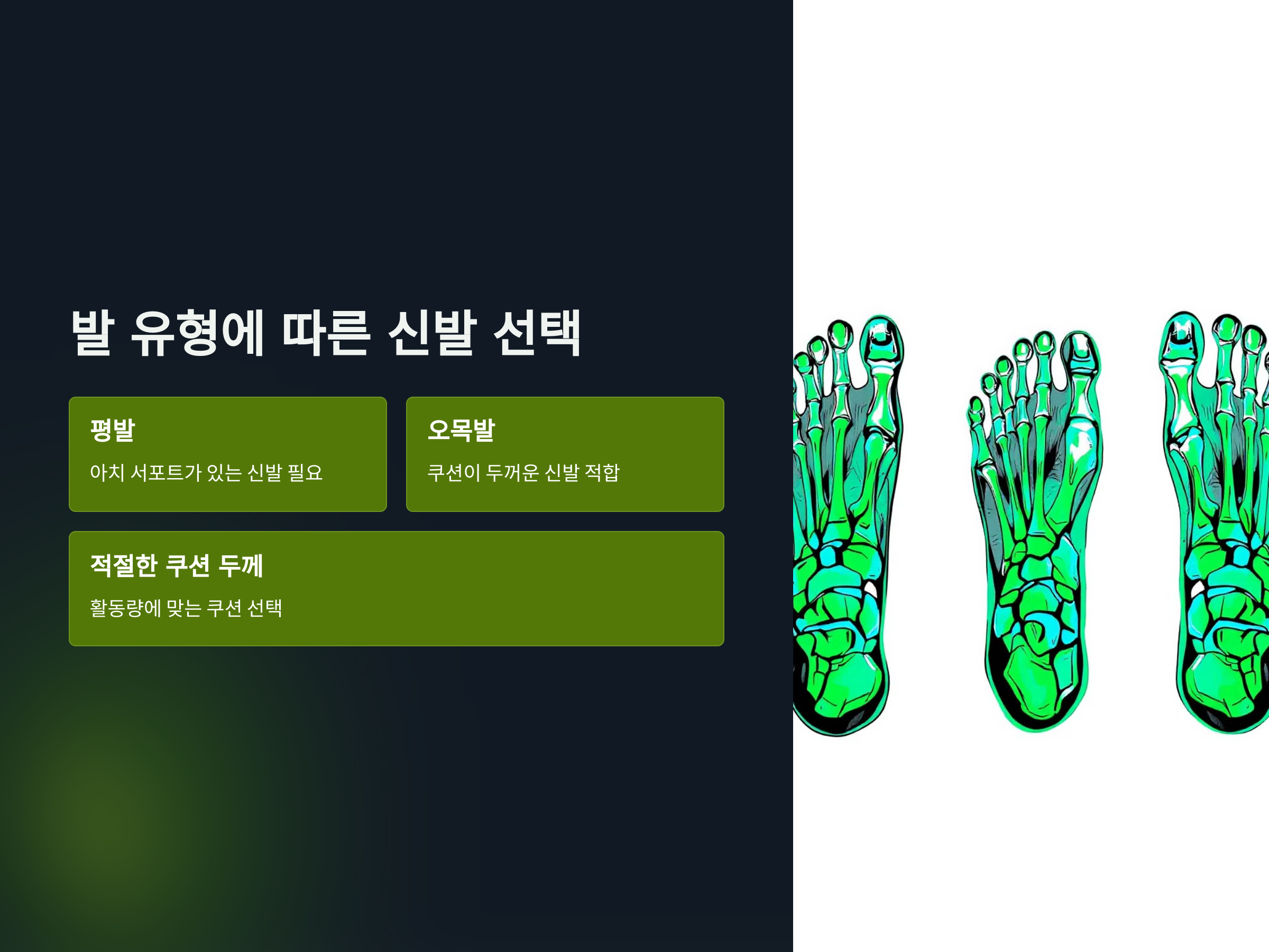 - 평발: 아치가 낮아 충격 분산이 어려운 경우, 아치 서포트가 있는 신발이 필요합니다.