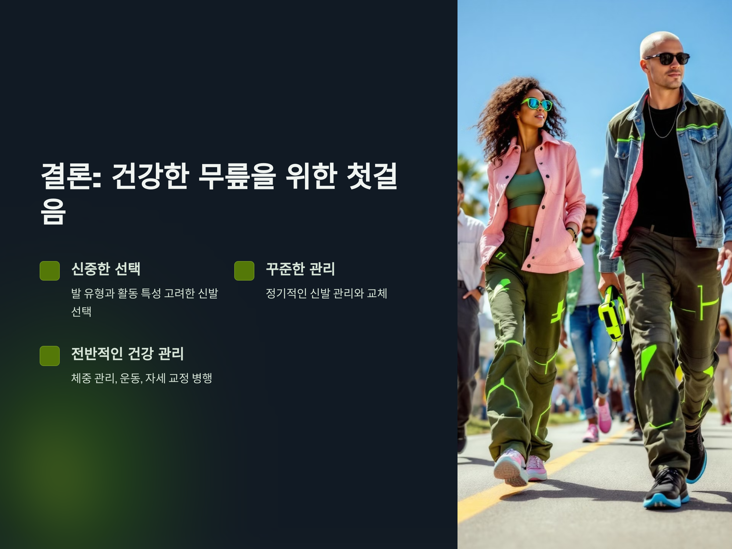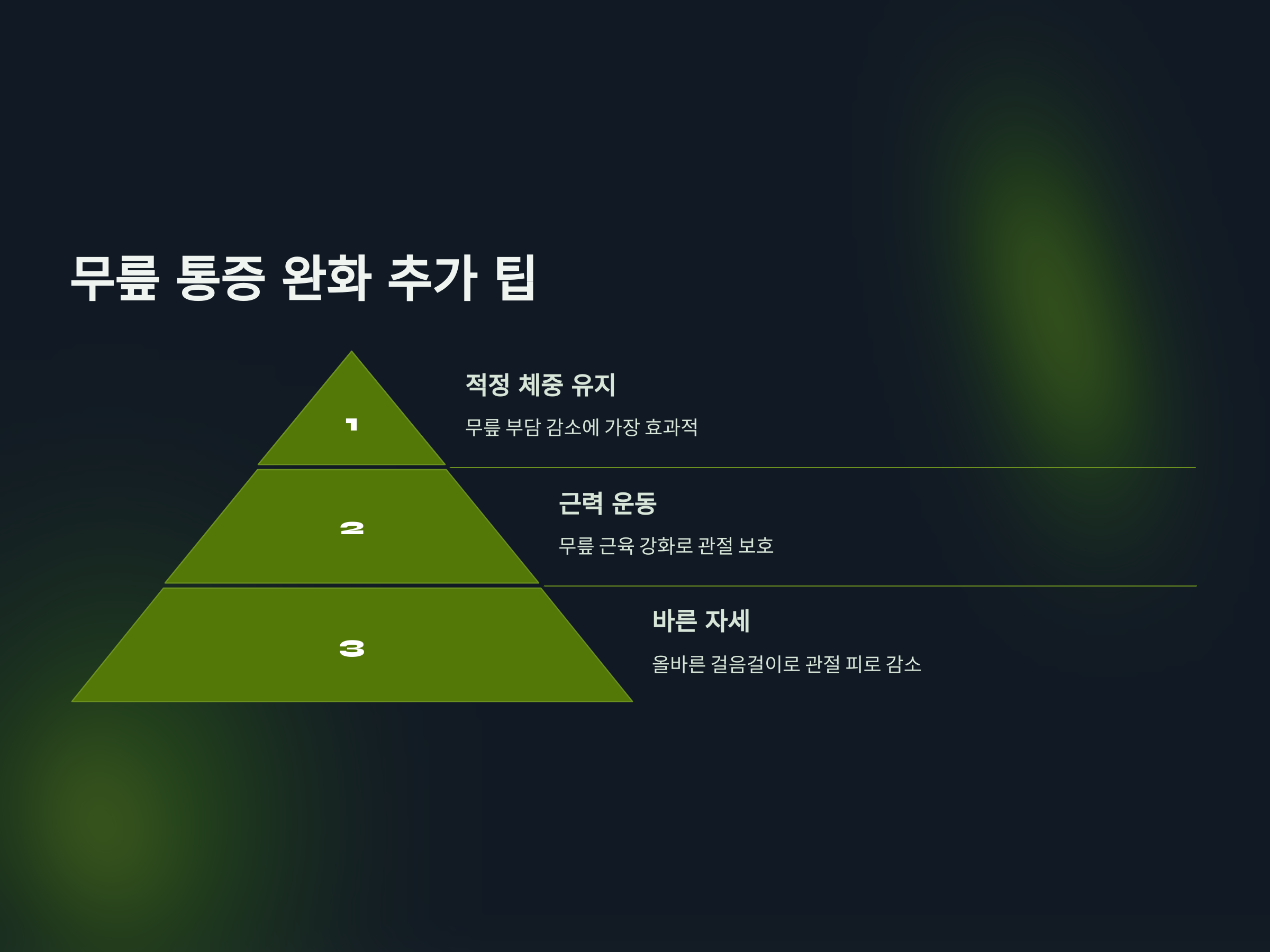 신발 선택뿐 아니라 생활습관도 무릎 건강에 영향을 미칩니다. 다음의 팁을 참고하세요.