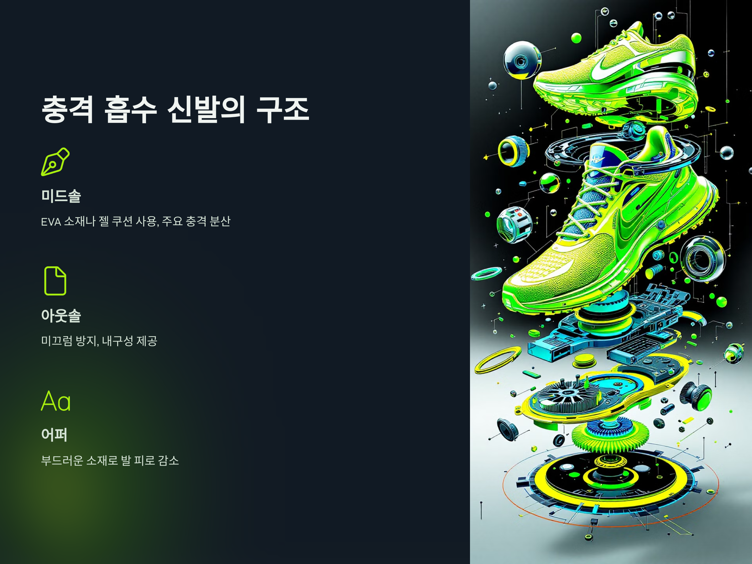 충격 흡수 신발은 일반 신발과는 다른 독특한 구조를 가지고 있습니다. 이 구조는 무릎에 가는 하중을 줄이고 편안한 착용감을 제공합니다.