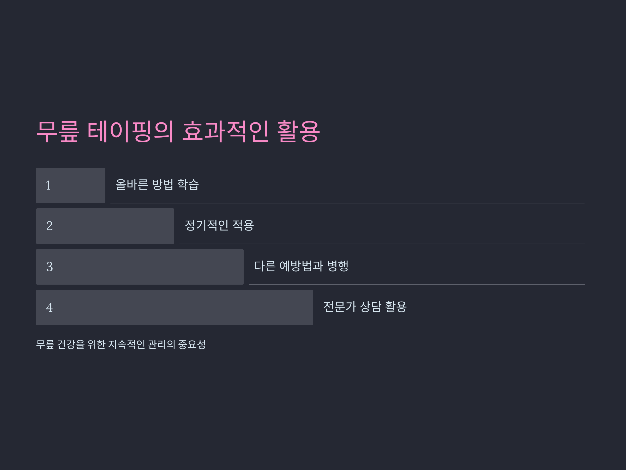 테이핑의 목표는 무릎의 안정성을 높이면서도 움직임을 방해하지 않는 것입니다.