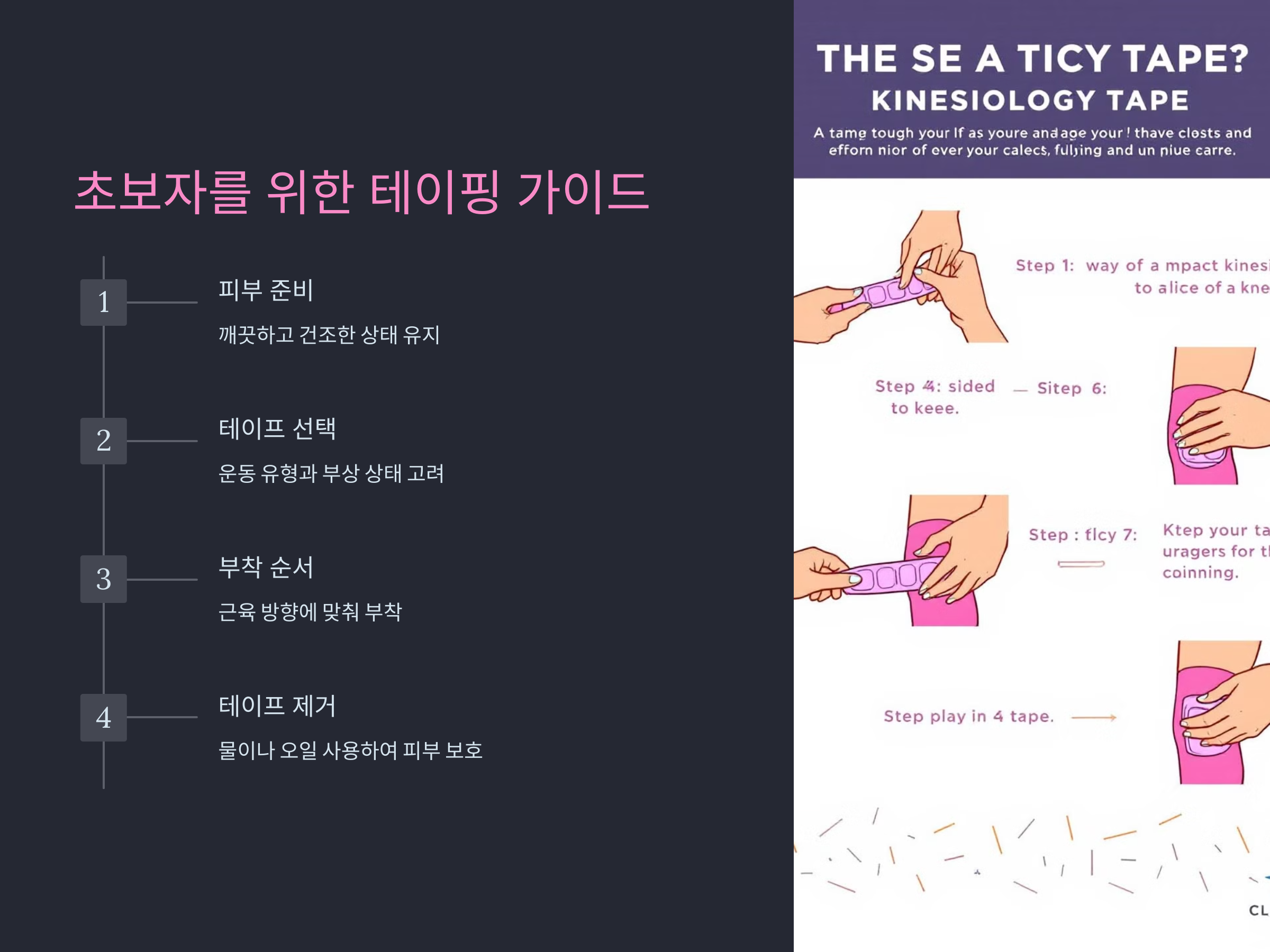 - 부착 순서: 테이프를 과도하게 당기지 않고 근육의 방향에 맞춰 부착합니다.