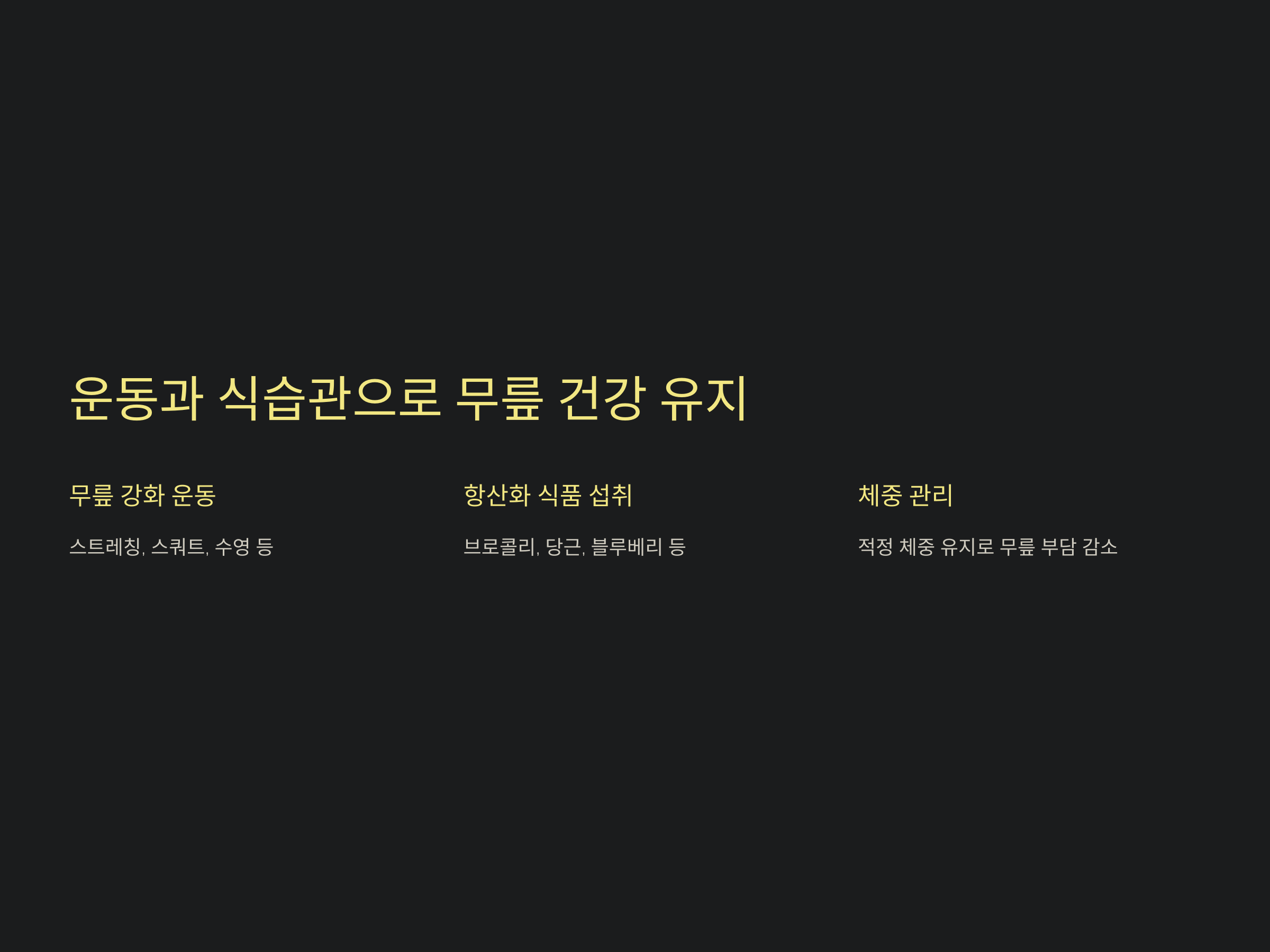 - 체중 관리: 적정 체중을 유지하여 무릎 부담을 줄이세요.