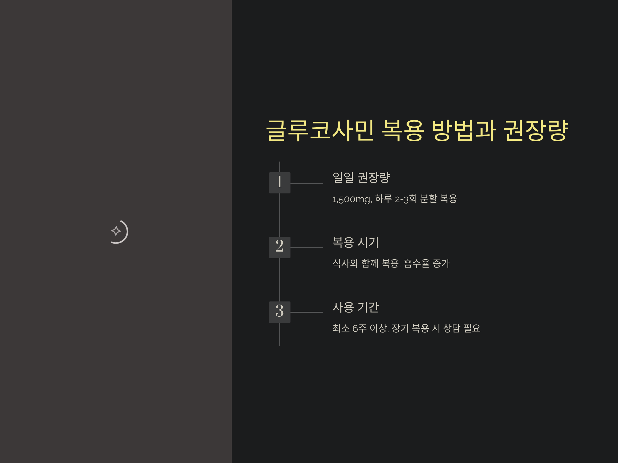 - 일일 권장량: 일반적으로 1,500mg의 글루코사민을 하루에 2~3회로 나누어 복용합니다.