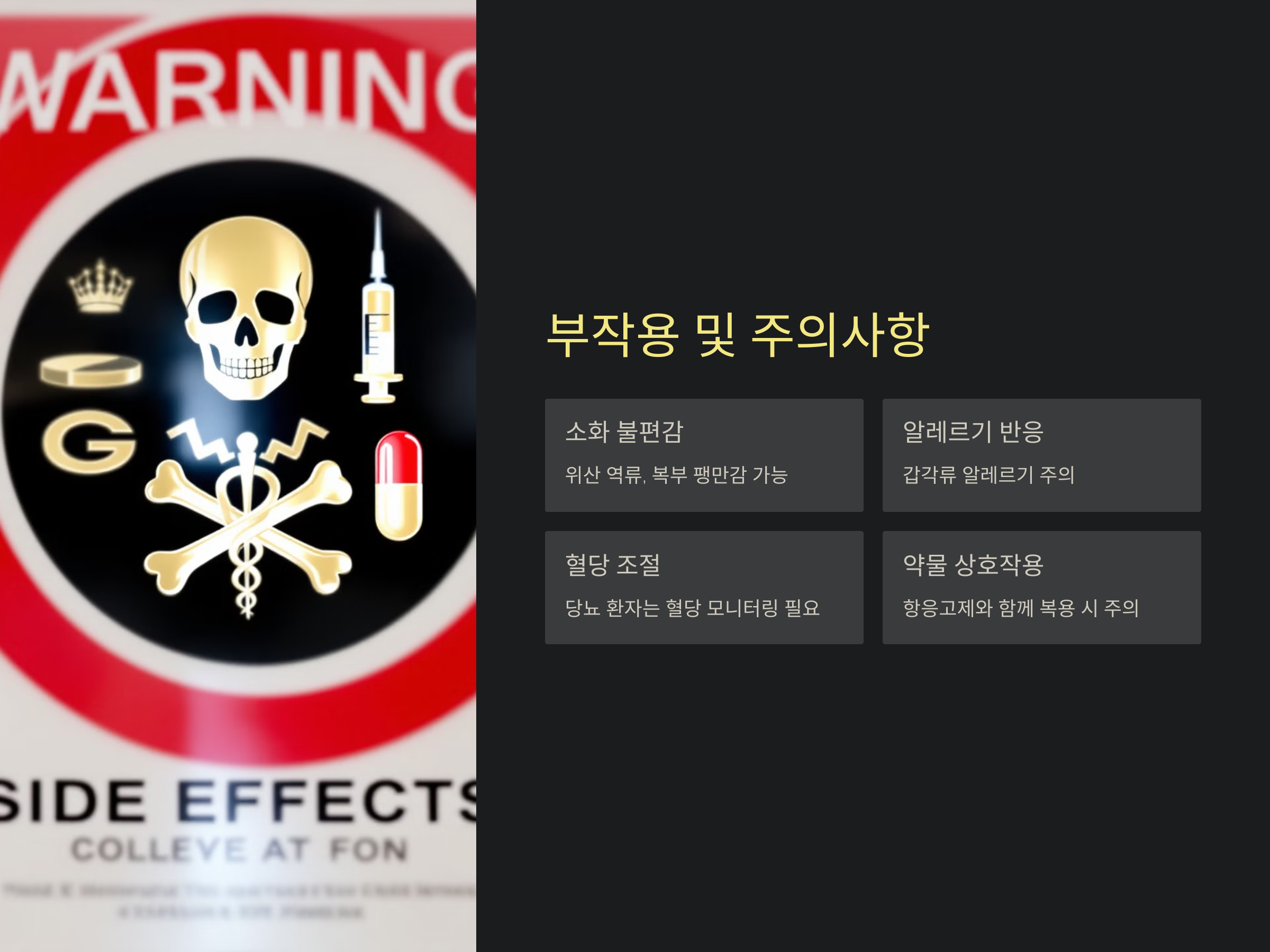 글루코사민은 일반적으로 안전하다고 여겨지지만, 일부 사람들에게는 부작용이 나타날 수 있습니다. 주의해야 할 점은 다음과 같습니다: