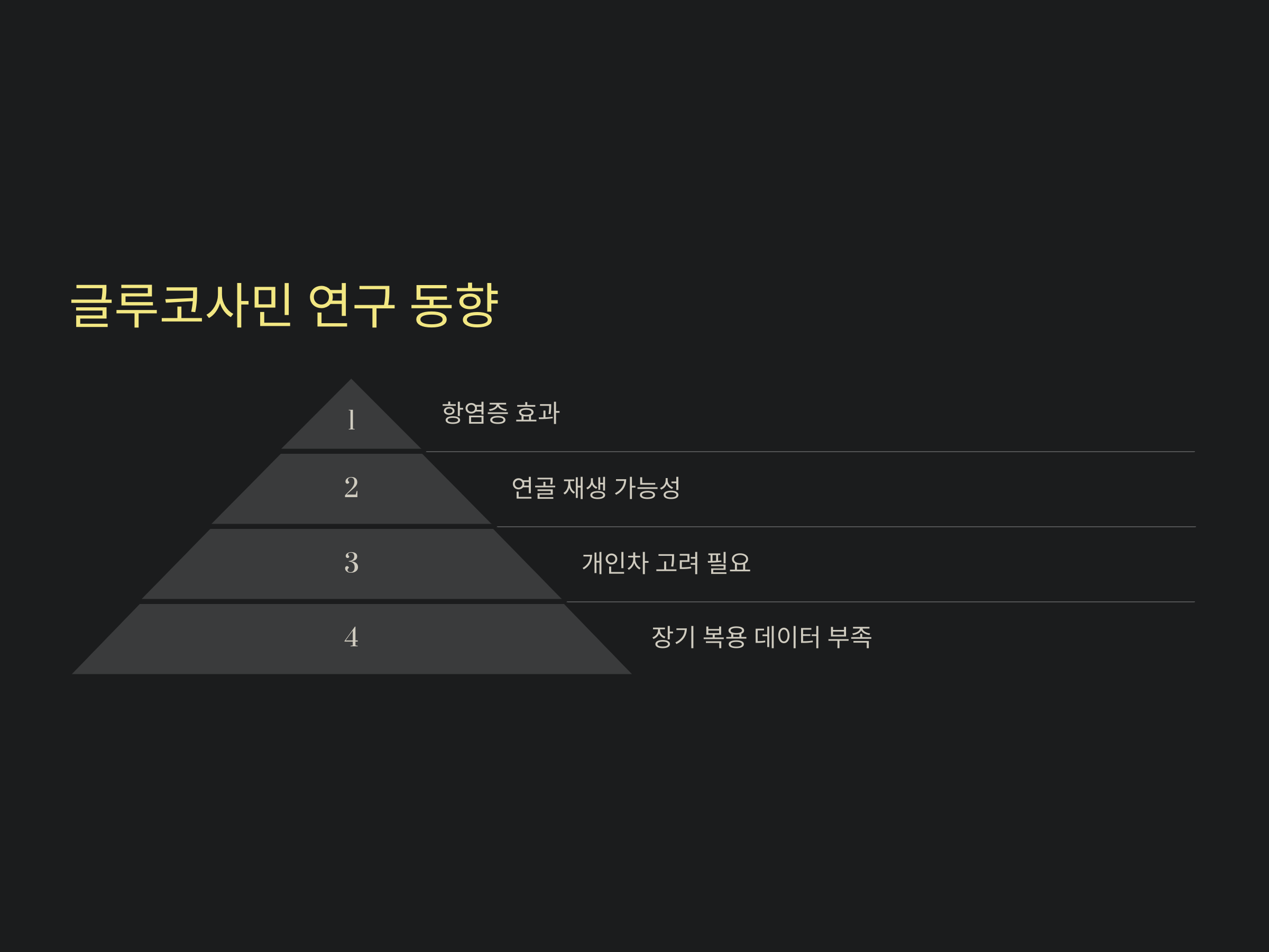 최근 연구에서는 글루코사민이 관절염 증상 완화 외에도 항염증 효과와 연골 재생에 긍정적인 영향을 미칠 가능성이 제시되고 있습니다. 하지만 모든 연구가 이를 지지하는 것은 아니며, 다음과 같은 사실을 참고해야 합니다:
