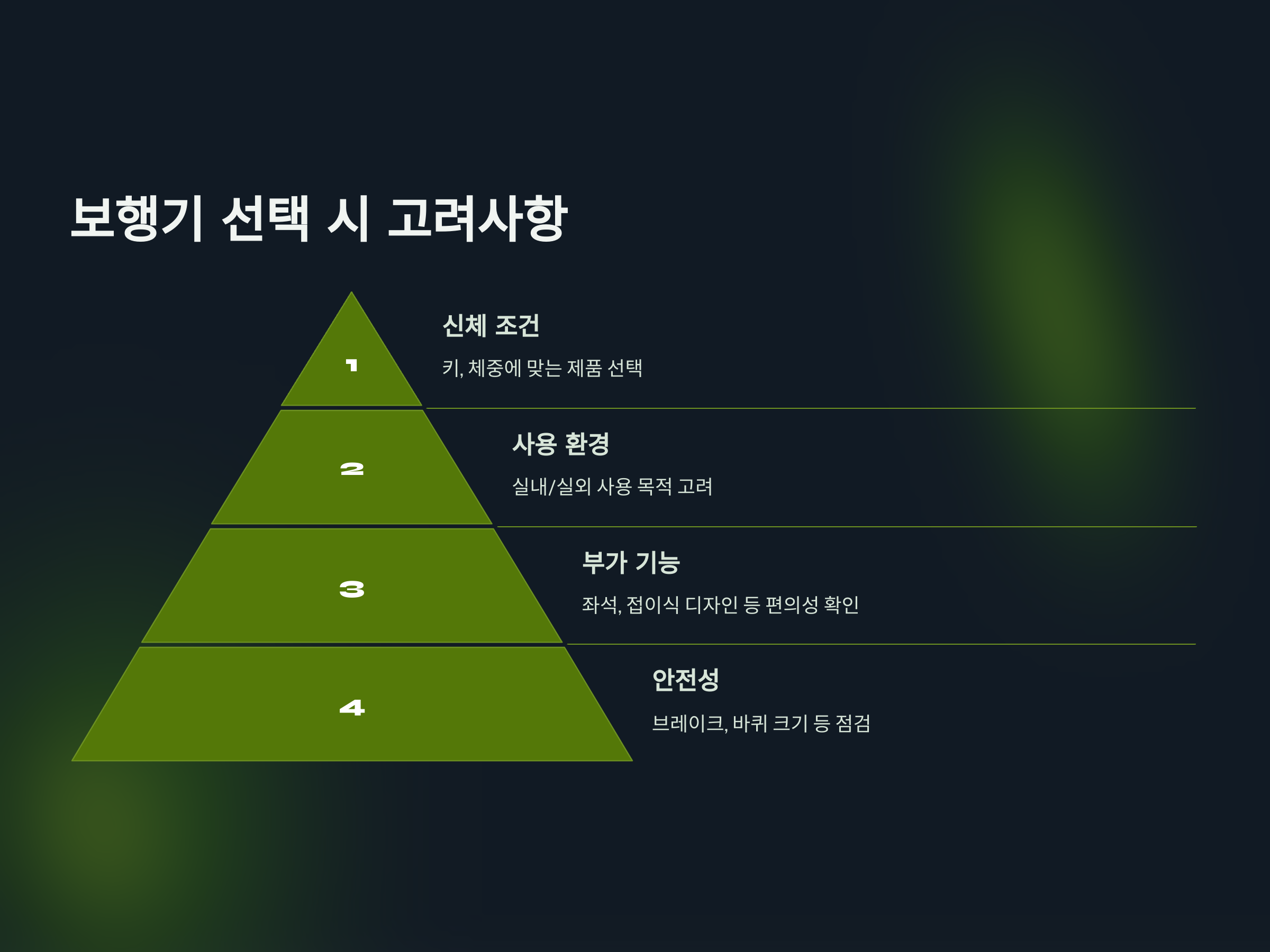 보행기를 선택할 때는 신체 조건과 사용 환경을 고려해야 합니다. 올바른 선택은 무릎 건강 유지와 편리한 이동을 돕습니다.