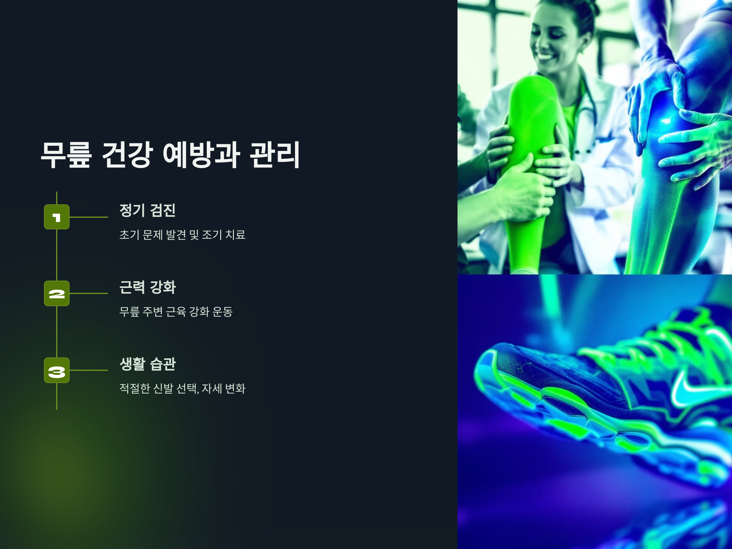 - 과도한 체중은 무릎 관절에 부담을 줍니다. 균형 잡힌 식단과 규칙적인 운동으로 건강한 체중을 유지하세요.